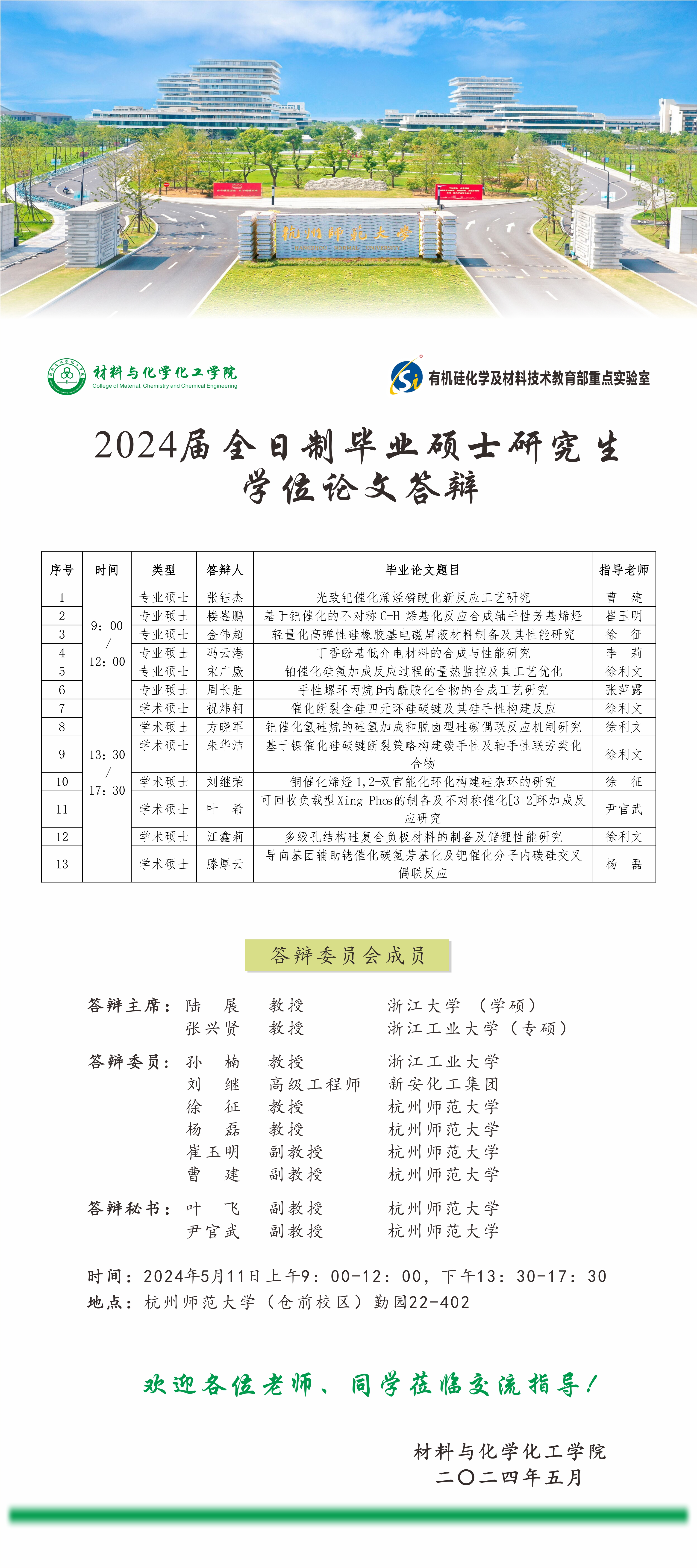 2024届硕士研究生毕业论文答辩安排(5月11日)