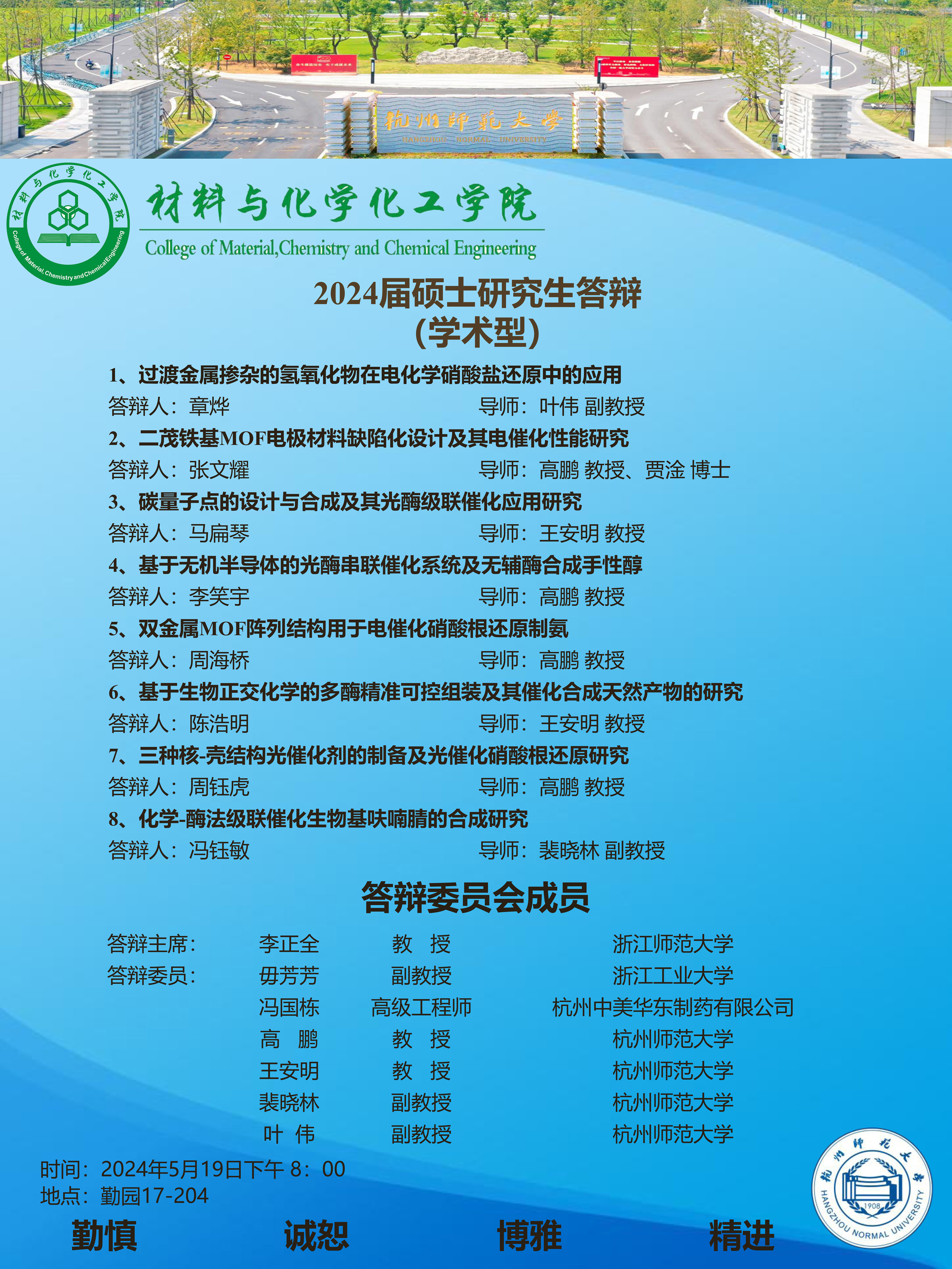 2024届硕士研究生毕业论文答辩安排(5月19日)