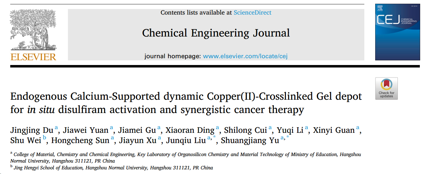近日,做爱视频 刘俊秋教授团队在载药水凝胶用于肿瘤局部联合治疗方面取得新进展。相关研究结果以“Endogenous Calcium-Supported dynamic Copper(II)-Crosslinked Gel depot for in situ disulfiram activation and synergistic cancer therapy”为题发表在Chemical Engineering Journal (IF: 15.1)。