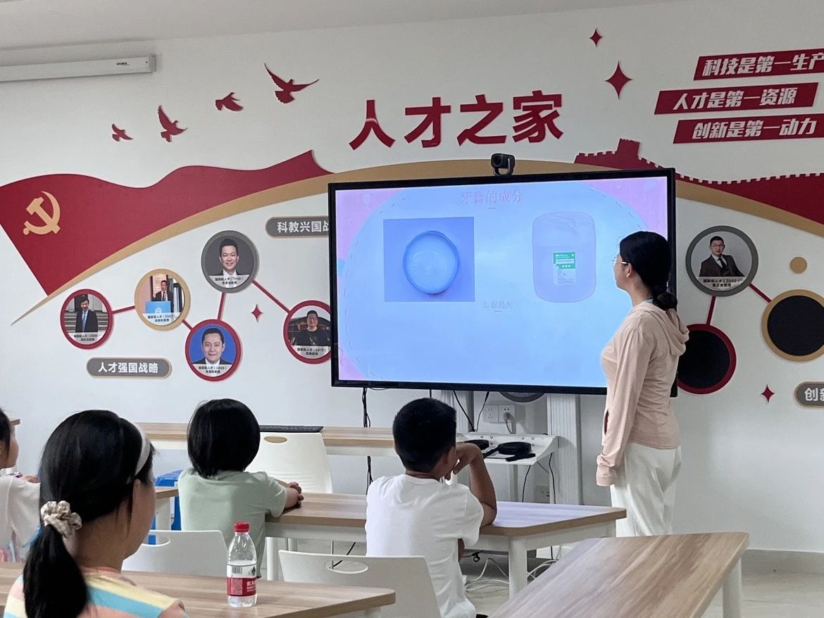 期间,志愿者们协助管理纪律,答疑。课堂上激发了小朋友们对于制作牙膏的期待。