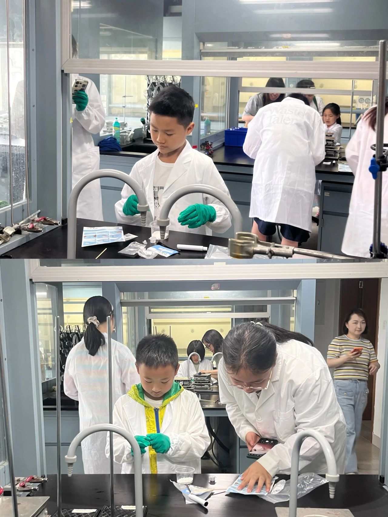 授课结束后,大家在勤园18号楼312教室进行牙膏制作实验。活动已提前为各位小朋友准备好所需的实验服和实验手套。小朋友们穿戴好即在家长的陪同和志愿者们的协助下进行实验。在小朋友、家长及师生三方的共同努力下,牙膏制作实验顺利进行。
