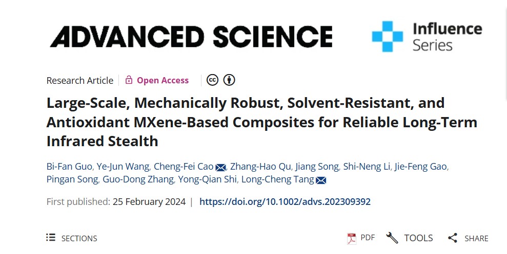 近日,做爱视频 汤龙程教授团队通过结合超支化聚硅氧烷(HSi)与类纤维素的透明质酸(HA),设计了一种可规模化制备且能满足长期红外隐身要求的柔性MXene基红外隐身复合材料,解决了传统MXene基材料在室外复杂环境下耐候性差的难题。相关研究成果以题为“Large-Scale, Mechanically Robust, Solvent-Resistant, and Antioxidant MXene-Based Composites for Reliable Long-Term Infrared Stealth”发表在国际知名期刊Advanced Science (IF=15.1)上。