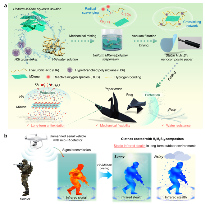 红外隐身材料可以在复杂环境中伪装物体,躲避红外探测器的探测,对生命安全至关重要。MXene是一种用于热伪装领域的“后起之秀”材料,因其较低的中红外发射率,在不同温度(-10~500oC)下均表现出了优异的红外隐身能力。然而,MXene在潮湿环境极易氧化,导致隐身性能会快速衰减;虽然在MXene片上引入改性材料能够抑制了其氧化,但常常不可避免地会削弱红外隐身性能,甚至完全失去热伪装功能。因此,开发兼顾红外隐身和长时环境可靠性的MXene热伪装材料仍是一个挑战。最近,做爱视频 汤龙程教授课题组提出了超支化聚硅氧烷分子(HSi)和透明质酸(HA)协同改性的MXene复合材料,构建出具有共价键和氢键的双重分子网络,能够显著阻隔MXene氧化的同时不会影响其隐身性能,共改性后复合材料显示出优异的力学性能、良好的耐水/耐溶剂性、稳定抗氧化性和可靠的室外环境热伪装能力。
