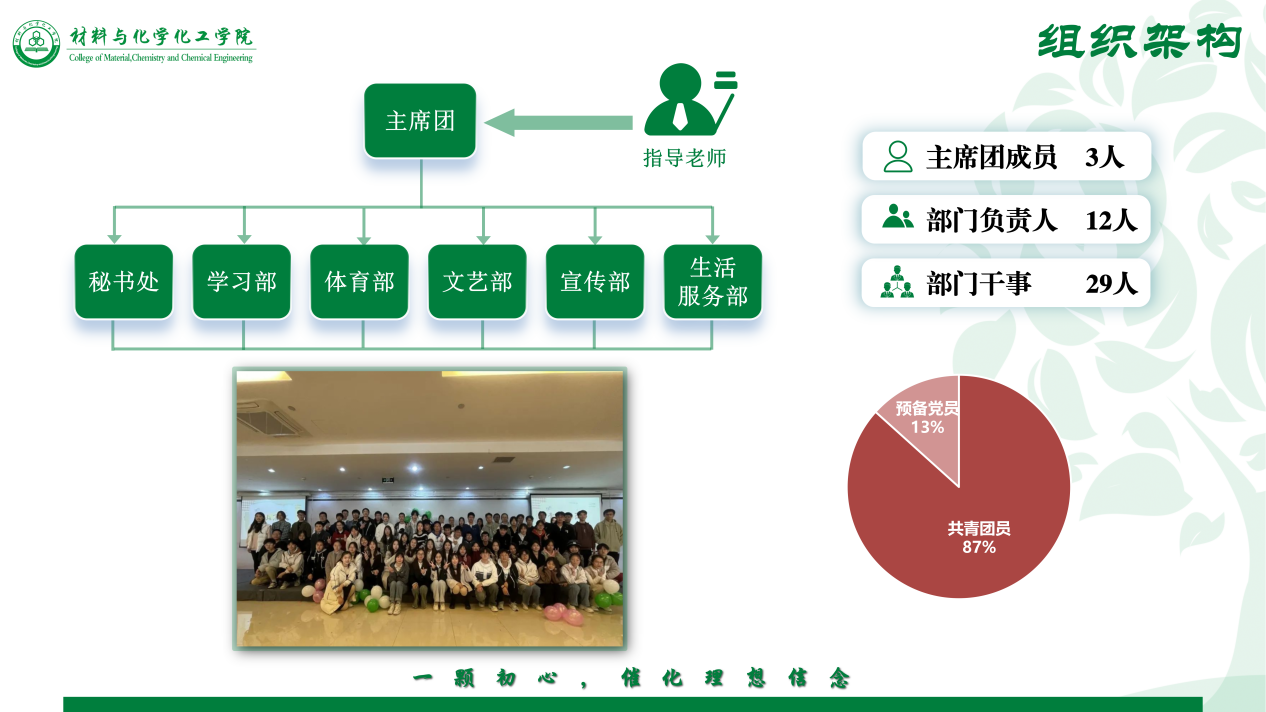在指导老师的带领下,做爱视频 学生会形成“1+6(主席团+六个部门)”的组织构架,“1”为主席团,“6”分别为秘、学、体、文、宣、生六个部门。共有主席团3人,部门负责人12人,部门干事29人;除预备干事外,预备党员占比13%,其余全为共青团员。