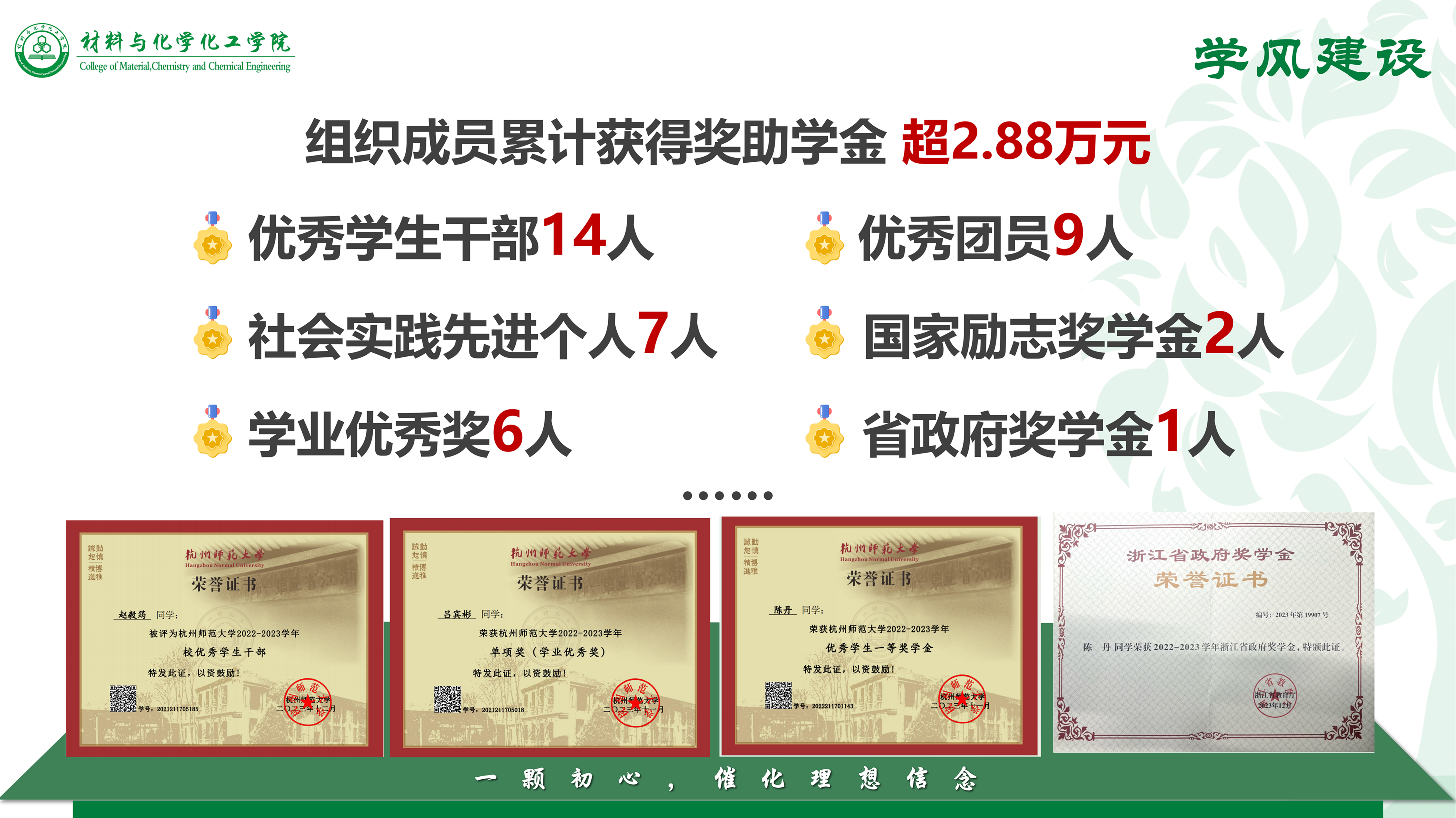 学风建设——多名组织成员获“优秀学生干部” “优秀团员” “暑期社会实践先进个人”称号,综合荣誉40余项,形成了优良的学风氛围。