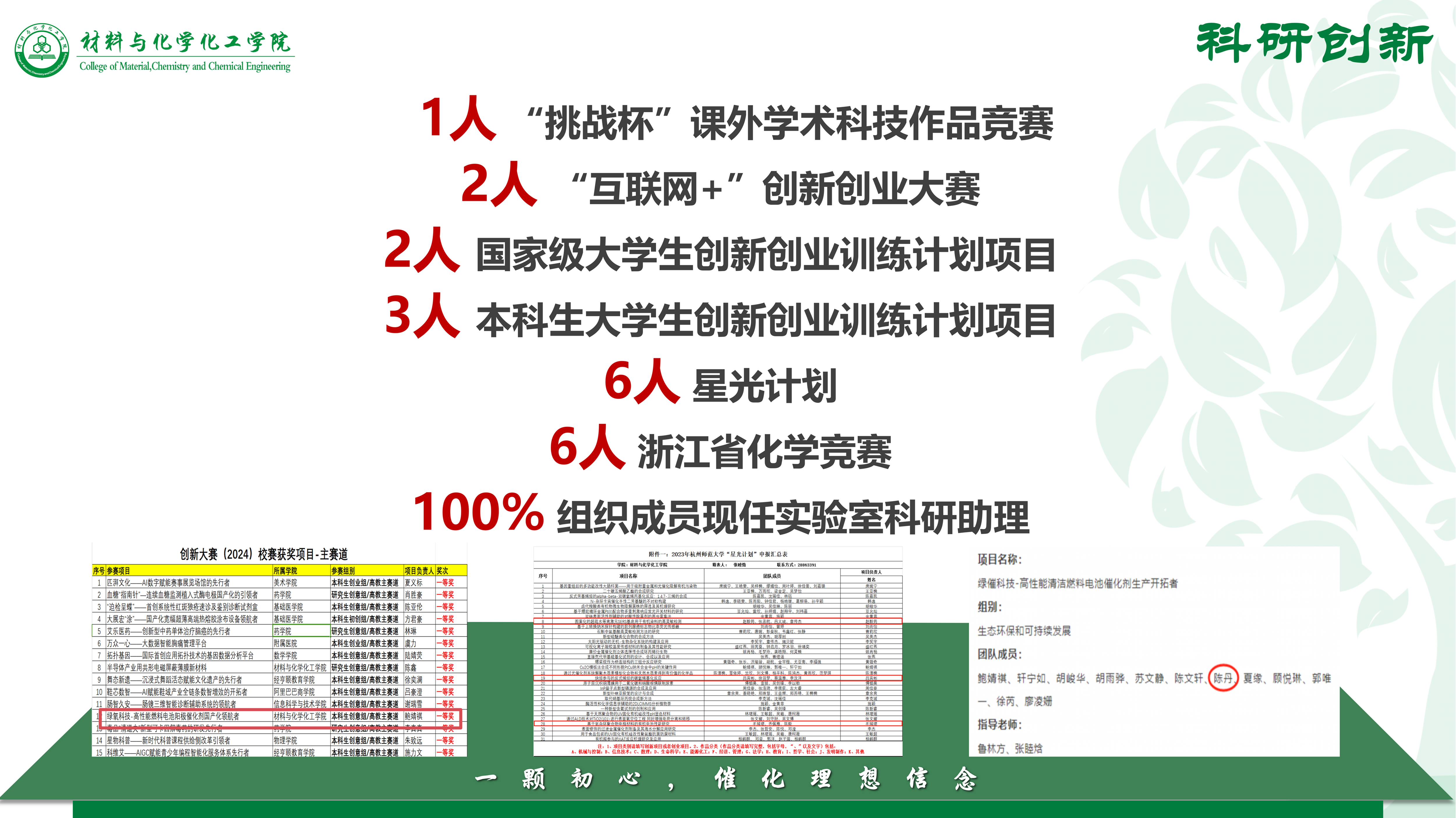 科研创新能力的提升——部分组织成员积极参与各类科创项目和化学竞赛,如挑战杯、互联网+、国创、本创、星光计划等等,并且,100%的组织成员现任实验室科研助理。