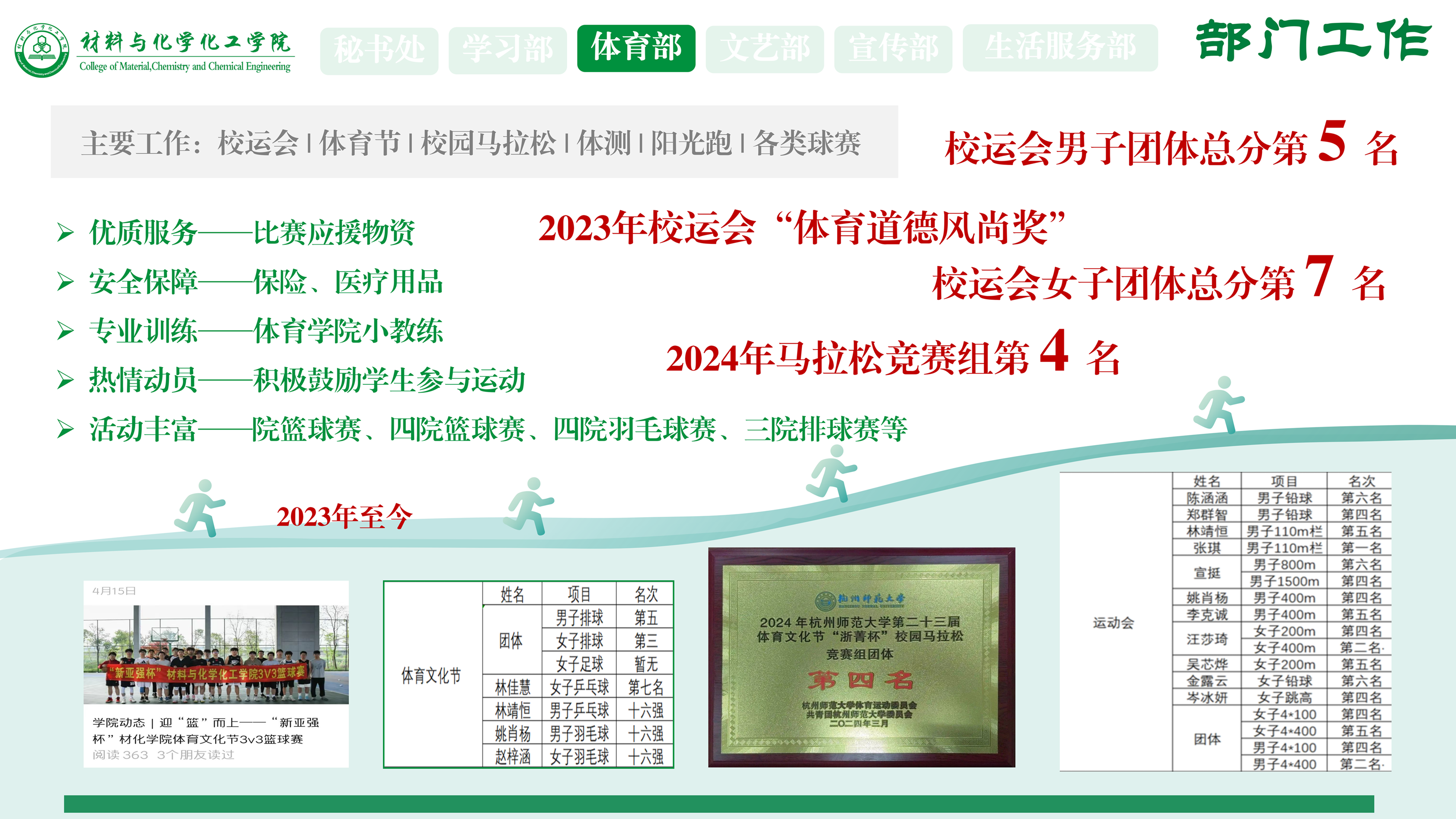 2023年至今,做爱视频 在体育方面也取得了许多成就,如2023年校运会“体育道德风尚奖”、男子团体总分第5名、女子团体总分第七名,2024年马拉松竞赛组第4名等优异成绩,在最近开展的体育节活动中,做爱视频 也荣获了女排第三、男排第五、女子乒乓球第七等佳绩,值得我们骄傲。