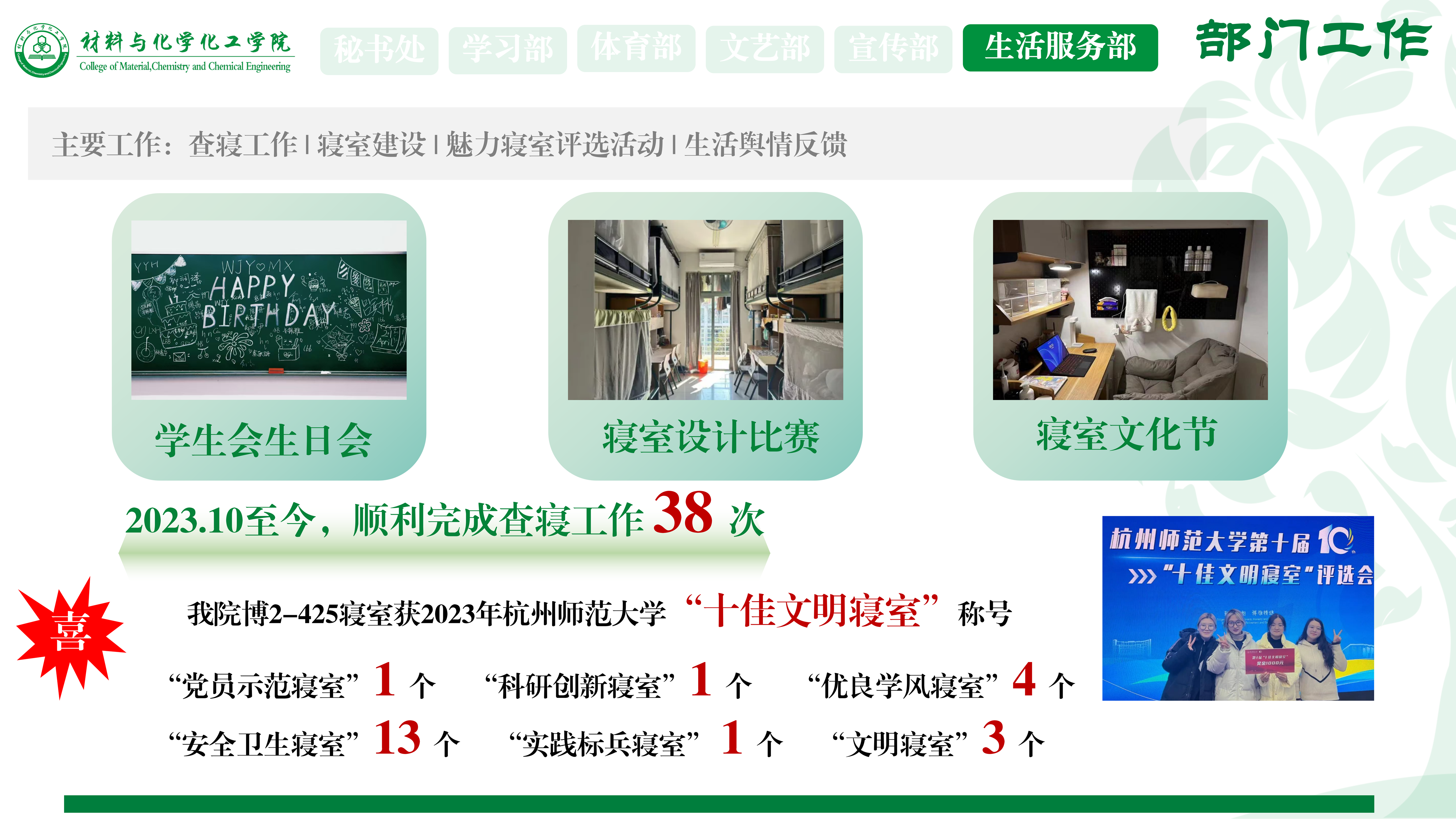 不仅是学生会最贴心温暖的部门,也是与同学们有着密切联系的部门,负责学院的寝室建设和生活舆情反馈,举办了学生会生日会、寝室设计比赛、寝室文化节等活动。