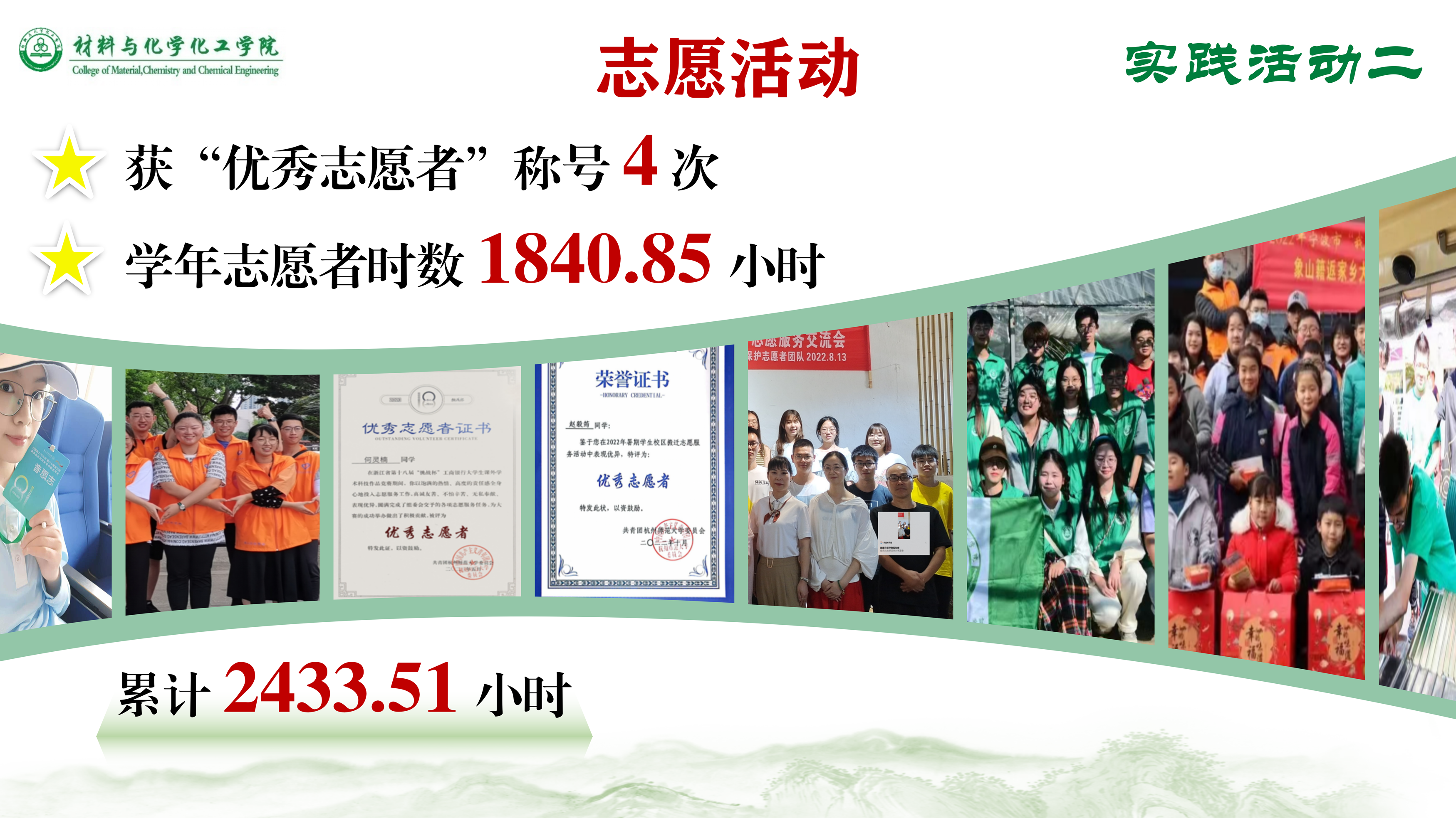同时,我们也积极参与日常的志愿活动,学生会成员共获“优秀志愿者”称号4次,学年志愿时数达1840小时,累计2433小时。