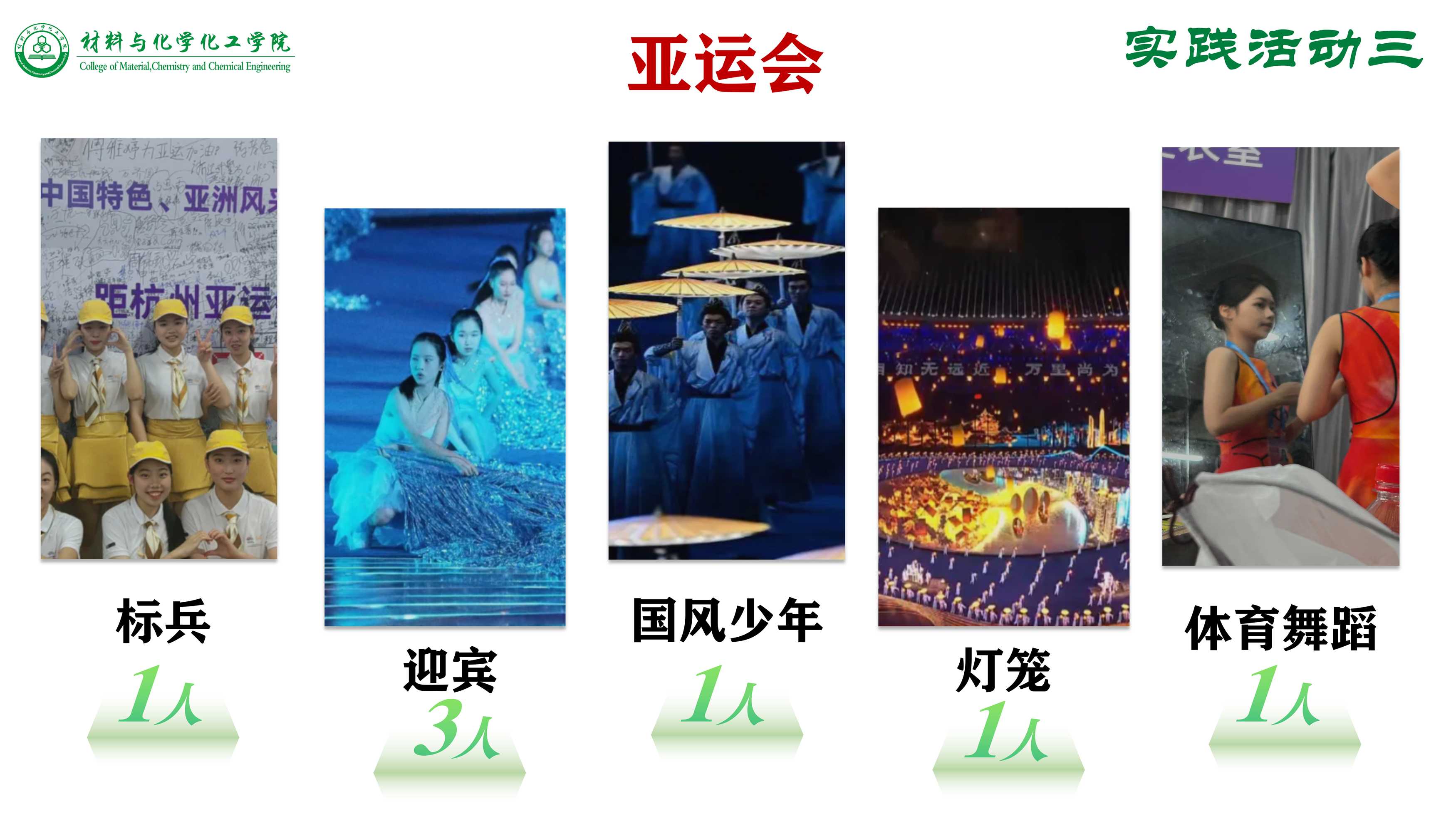 最值得我们骄傲的是,去年,7位学生会成员投身于亚运会开幕式的表演之中,在标兵组、迎宾组、国风少年组、灯笼组、体育舞蹈组都可以看到我们的身影。