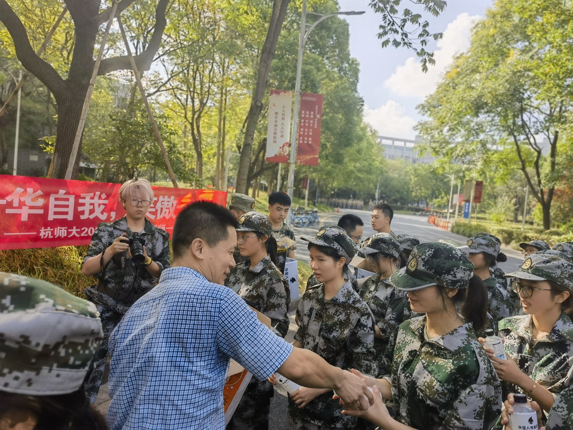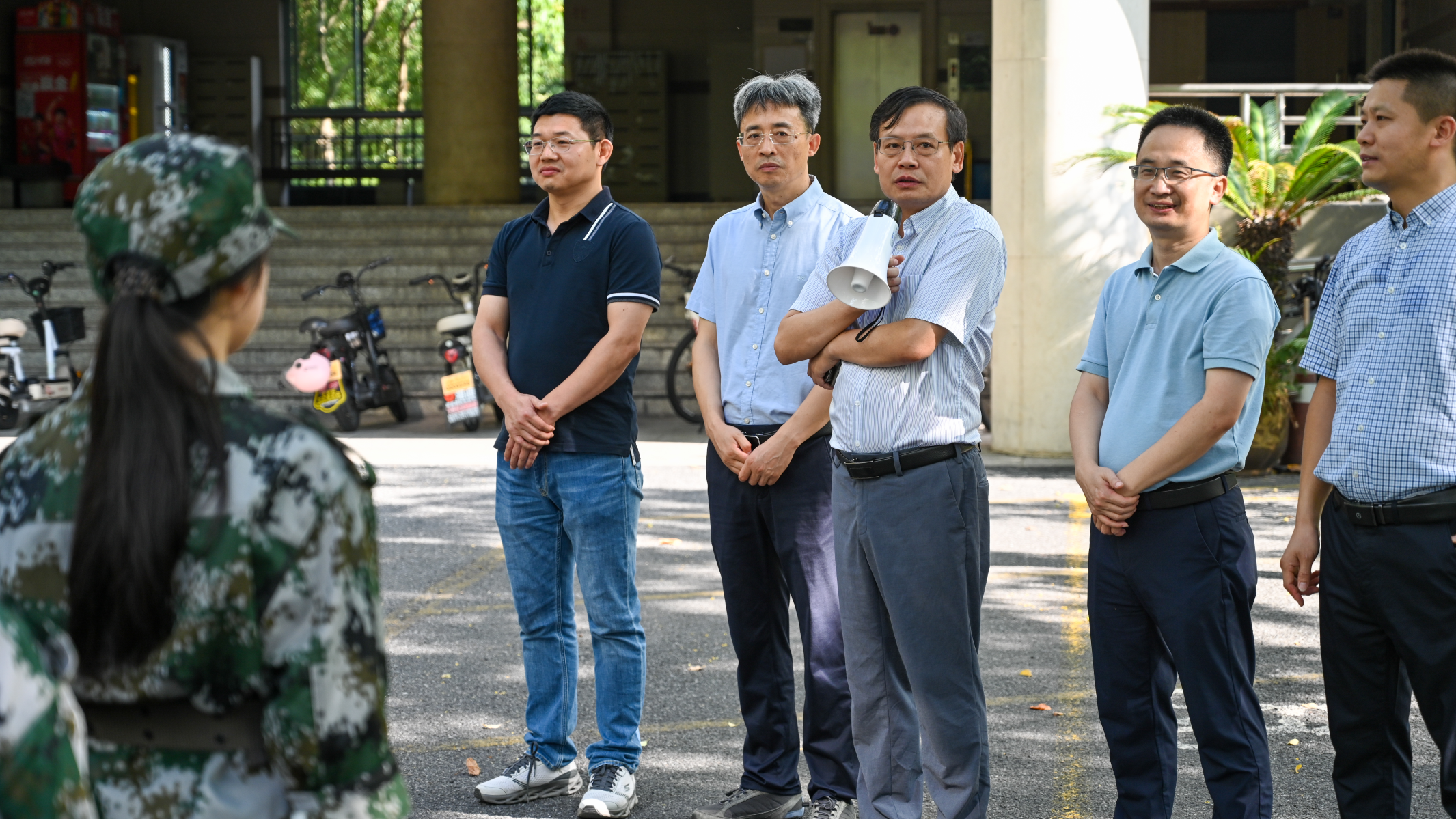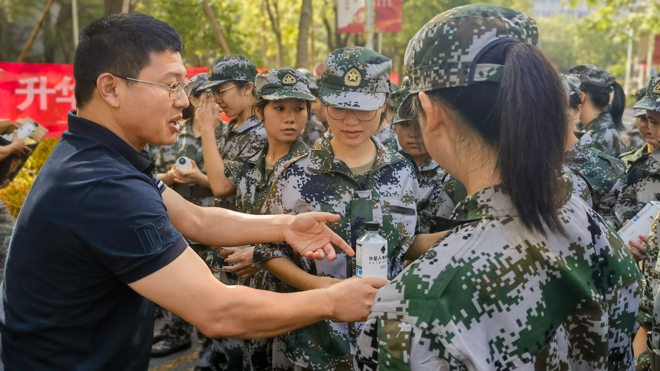 连日的高温酷暑考验着受训学生的体能和意志,也时刻牵动着学院领导和老师的心,为深入了解2024级新生军训情况,鼓舞提振军训学生士气,9月9日上午,学院院长章鹏飞,党委书记江齐里,副院长李志芳、黄又举,军训领导小组组长、党委副书记管庆江,辅导员赖雷雨和值班班主任叶婧一同前往军训训练场地,看望慰问全体参训学生与教官,为他们送去清凉。