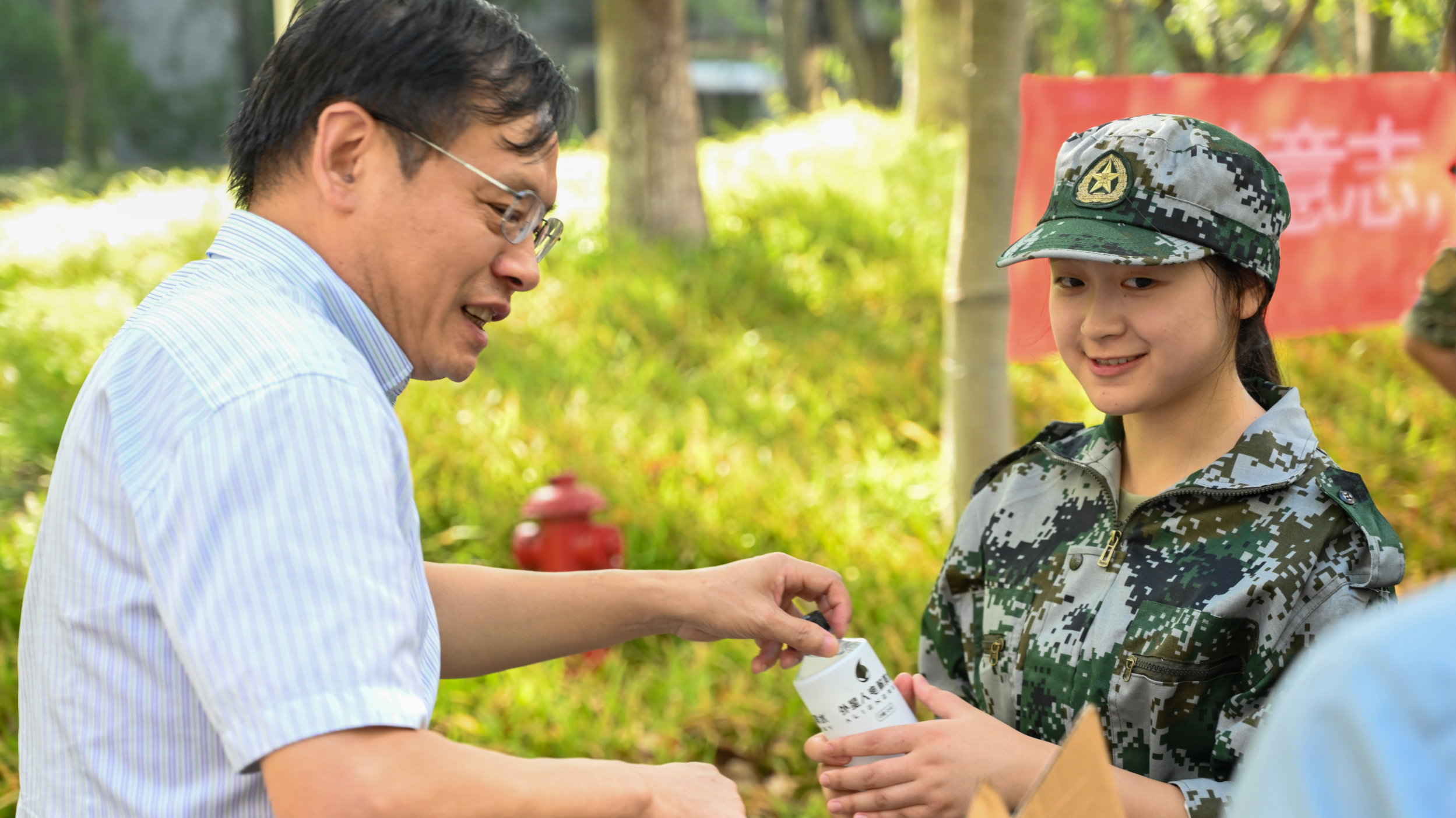 慰问现场,学院领导亲手将满载学院心意的慰问品逐一送到每一位同学、教官和老师手上,为炎炎烈日下坚持训练的师生送上关心关爱。学院领导的声声“辛苦、坚持”和同学们的“谢谢老师”交相呼应,场面温馨感人,拉进了彼此的距离和感情。