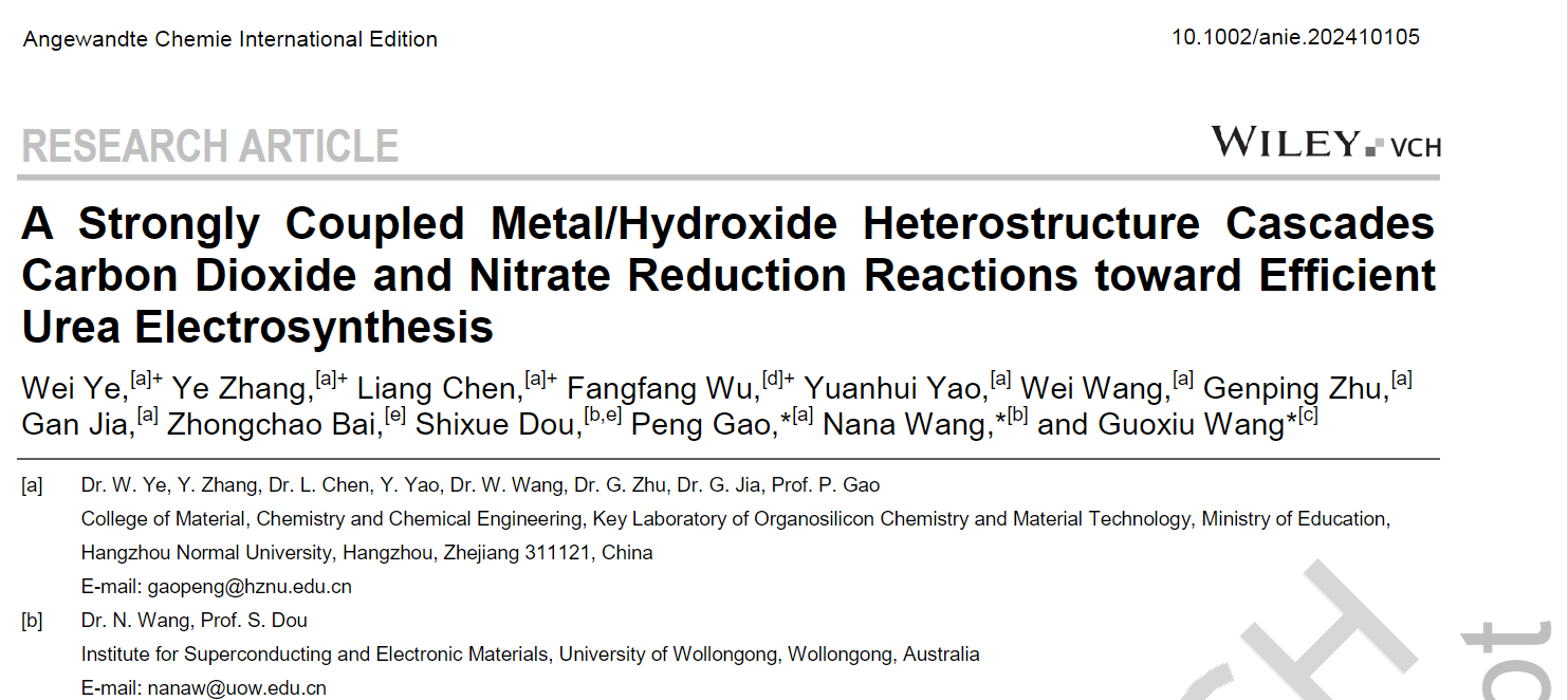 近日,做爱视频 高鹏教授团队叶伟博士与卧龙岗大学Nana Wang博士和悉尼科技大学Guoxiu Wang教授合作,报道了一种强耦合金属/氢氧化物界面用于串联二氧化碳和硝酸盐还原偶联电合成尿素,相关研究成果以题为“A Strongly Coupled Metal/Hydroxide Heterostructure Cascades Carbon Dioxide and Nitrate Reduction Reactions toward Efficient Urea Electrosynthesis”发表在国际知名期刊Angew. Chem. Int. Ed.(IF = 16.6)上。