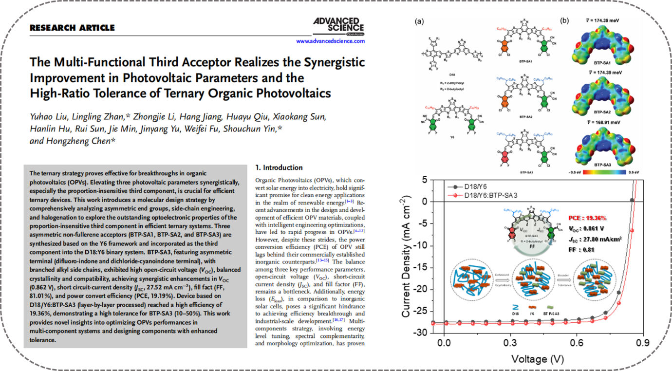 3. 对称分子末端,侧链工程以及卤化综合策略:基于Y6骨架设计合成三种不对称非富勒烯受体分子(BTP-SA1, BTP-SA2 和BTP-SA3),将其作为第三组分添加到主二元体系D18:Y6中,研究人员探究分子结构(不对称分子末端、侧链工程以及卤化)与三元体系光伏性能参数之间的关系。发现双氟茚酮末端的不对称受体BTP-SA3,可以实现高开路电压,调节分子结晶性和相容性,从而实现高兼容性,最终在三元体系中实现VOC(0.862 V),JSC(27.52 mA cm-2)和FF(81.01%)的协同提升,以及高效光伏性能(PCE为19.19%)。采用相同溶剂的逐步沉积法制备器件,D18/Y6:BTP-SA3的器件实现了高达19.36%的效率突破,是基于D18:Y6体系最高效率之一。此外,BTP-SA3的添加量从10%到50%,器件的光伏性能都能保持较高水平,实现了第三组分高容忍性。该工作为多元体系实现OPVs三个性能参数的协同提升,以及组分高容忍性的额外功能性组分分子设计提供了全面的指导(Adv. Sci., 2024, DOI: 10.1002/advs.202405303)。