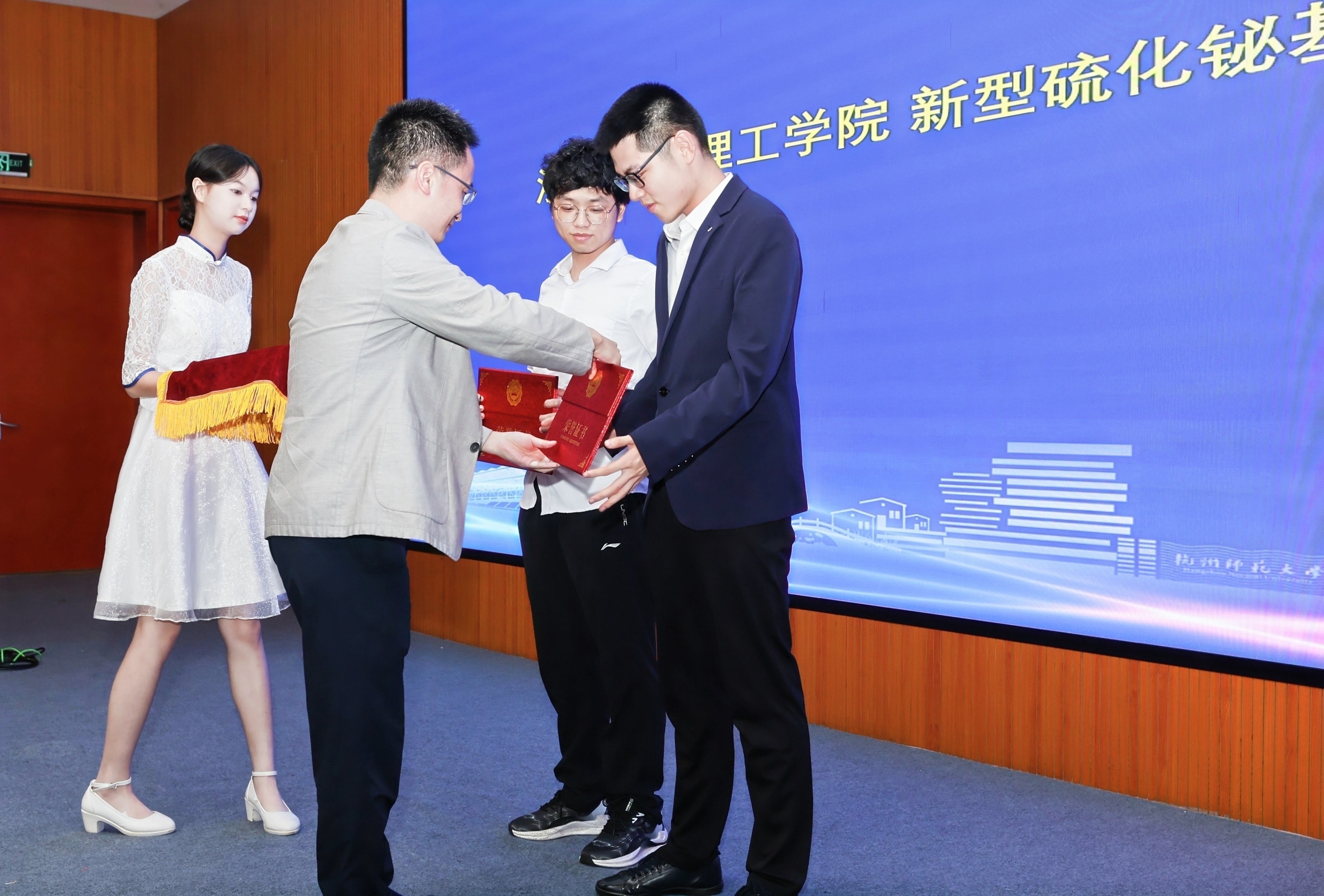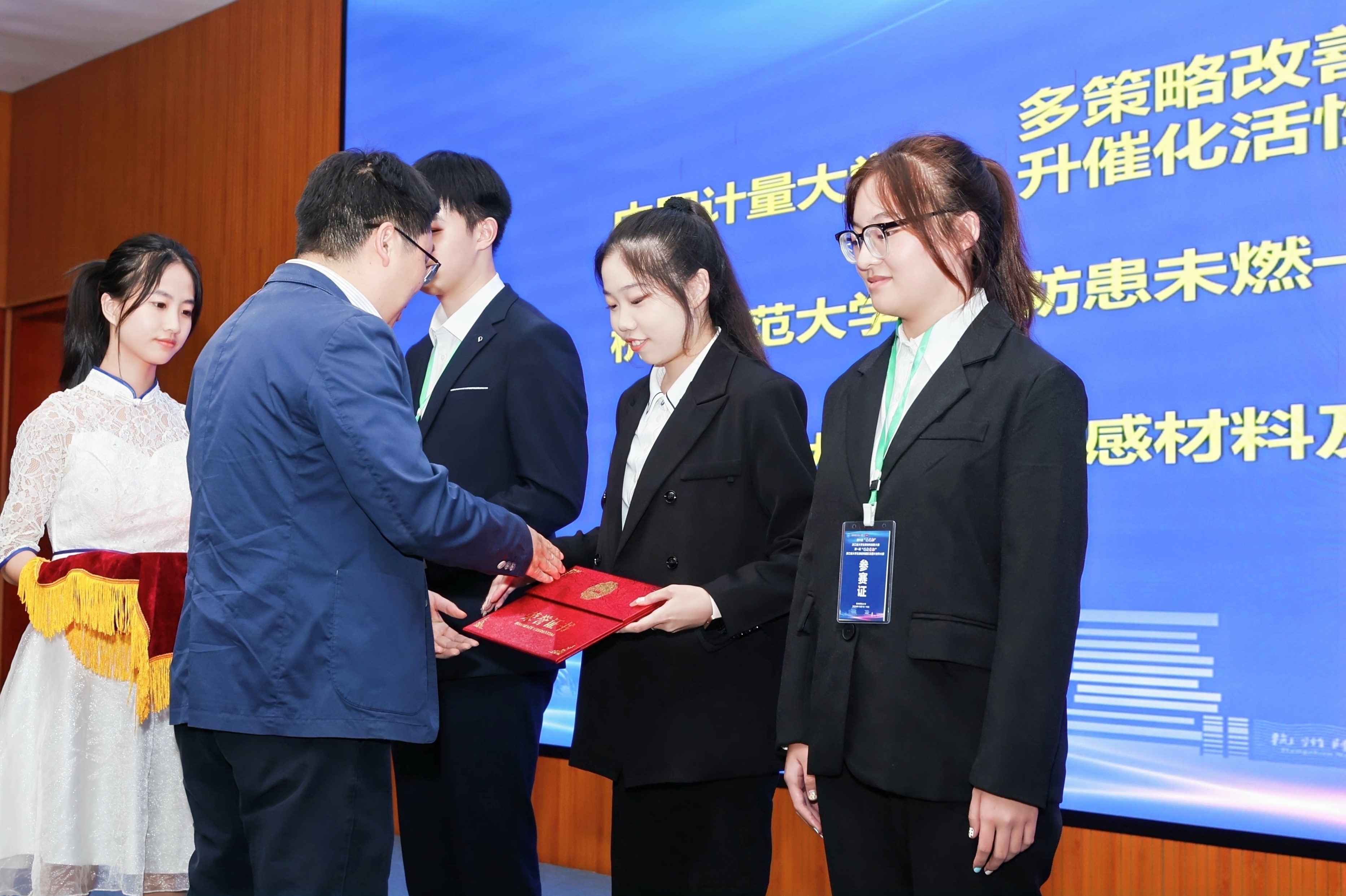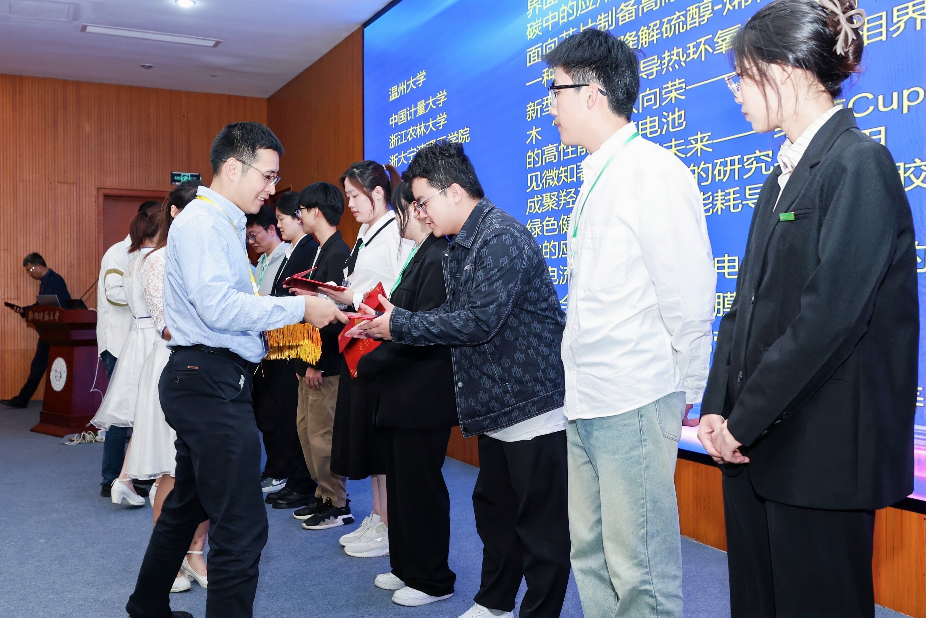 最后感谢各院校及教指委的支持,感谢浙江晶通新材料集团有限公司、杭州福斯特应用材料股份有限公司的支持,感谢参赛师生展现的良好作风,期望未来我省能有更多年轻人参与到大赛之中,让材化事业蓬勃发展,为我省科研创新事业贡献更大力量。期待材料大赛越办越好。闭幕式上院长章鹏飞,书记江齐里等各位嘉宾为获奖同学颁奖,大赛取得圆满结束。本次比赛中我校共有5个作品进入材料大赛决赛,获得一等奖1项、二等奖1项和三等奖3项。共4个作品进入图片大赛决赛,获得金奖作品1项、银奖作品3项。