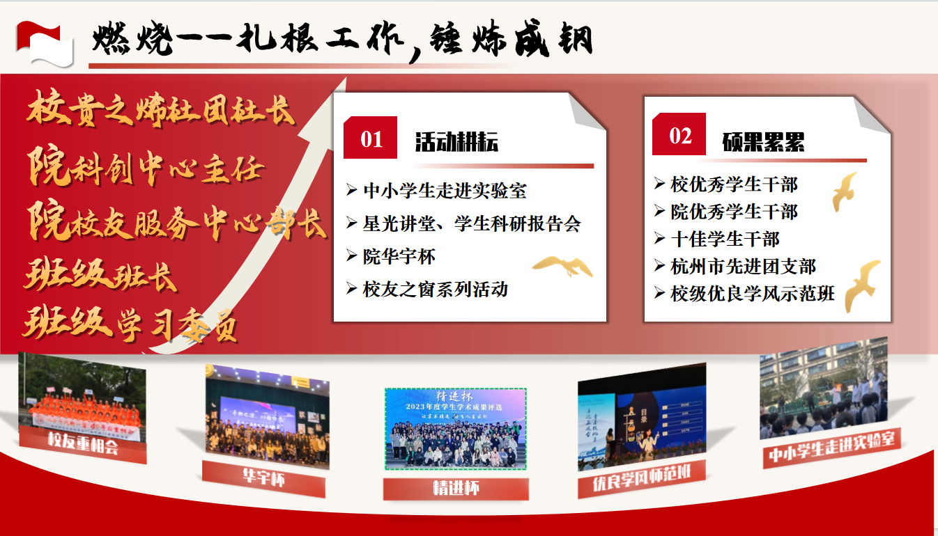 在学生工作方面,四人均担任组织和班级核心学生干部,在校期间举办了多项活动,并获得了优秀学生干部的荣誉称号。