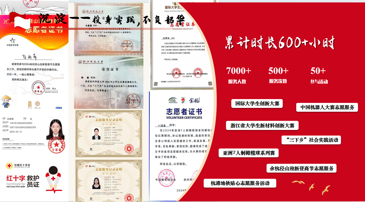 同时,她们四人还积极投身志愿服务,全寝志愿时数达600h,在亚运会、中国创新创业比赛、亚洲橄榄球中都不乏她们的身影。
