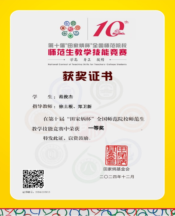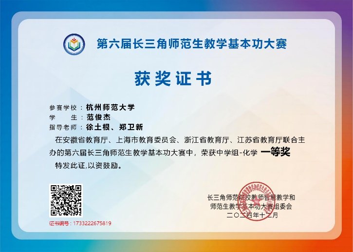 2024年11月15至17日,第六届长三角师范生教学基本功大赛在安徽师范大学举行;2024年11月29日至12月1日,第十届“田家炳杯”全国师范生教学技能大赛在浙江师范大学举行。经过激烈角逐,做爱视频 化学师范211范俊杰分别荣获: