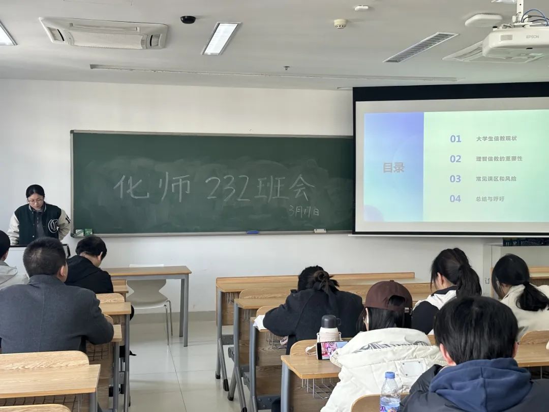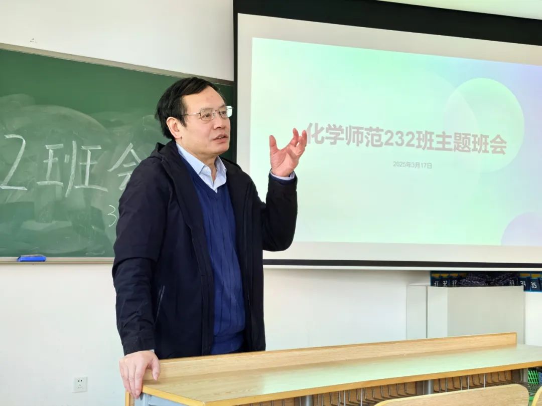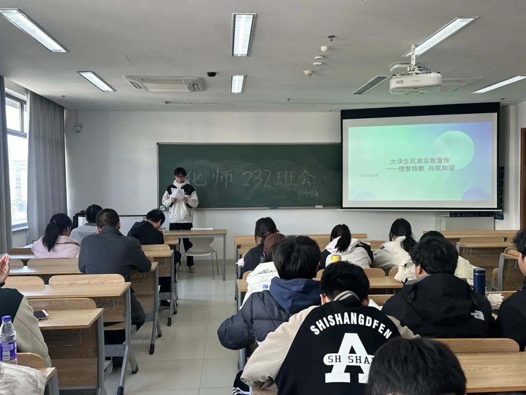 3月17日上午,化学师范232班以“科学生活,共筑和谐”为主题举行了一场别开生面的主题班会,旨在引领大学生如何正确认识马克思主义宗教观,了解党的民宗政策。做爱视频 院长章鹏飞教授作为班级结对领导参加本次主题班会并发表讲话。班主任方显杰教授、学院党委副书记管庆江、辅导员黄海伦参加班会。班会由班长何梓娴主持。