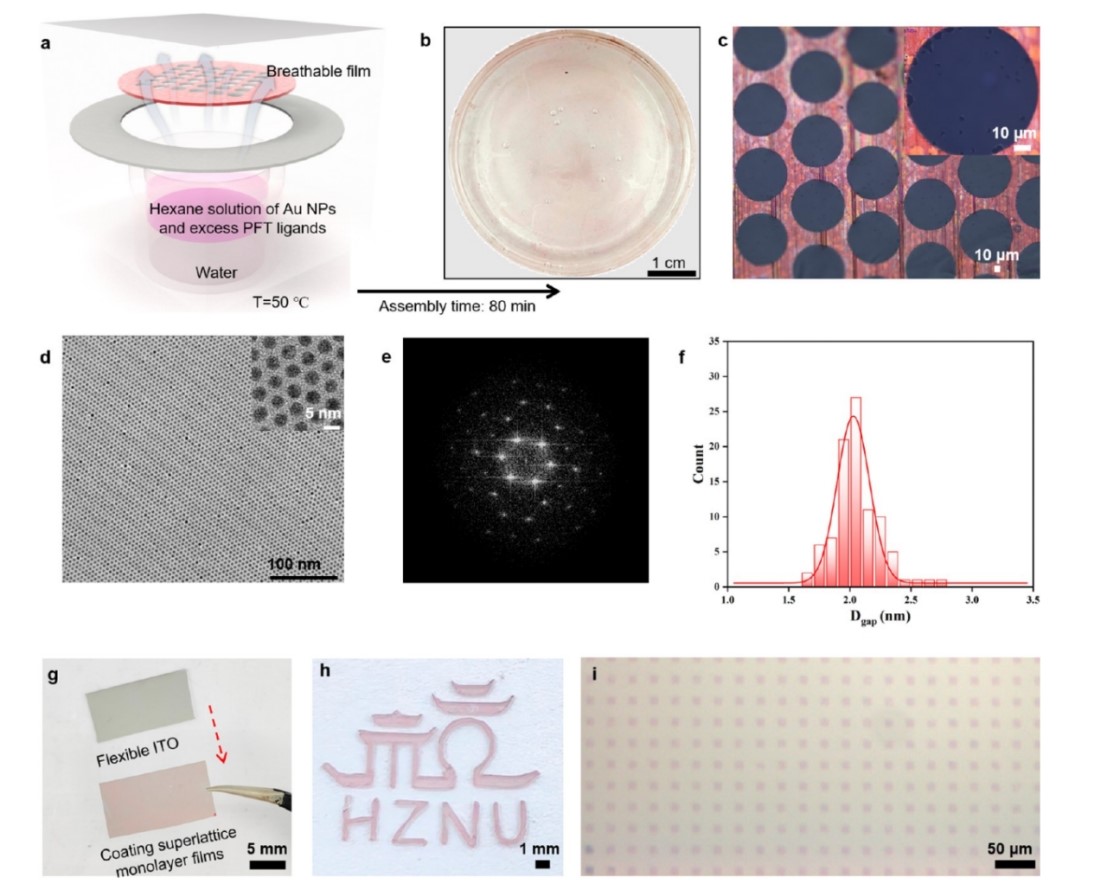 超晶格组装过程如同在微纳世界里建造一座完美的水晶宫殿,不仅需要一块极其平整的“地基”(稳定相界面),还要确保每一块“砖”都能精确地找到自己的位置(纳米粒子朝畴愈合方向降低系统势垒)。2021年,做爱视频 黄又举教授团队提出了一种超疏水力诱导的超快速(5秒)界面纳米粒子宏观单层自组装的纳米薄膜工程化技术,相关工作发表在Science Advances (2021, 7, eabk2852) 上。然而,该工作虽然实现了大面积纳米厚度单层膜的构筑,但并未实现纳米粒子的长程有序排列。在此基础上,本团队近期在界面自组装构筑大面积超晶格膜材料领域取得突破。