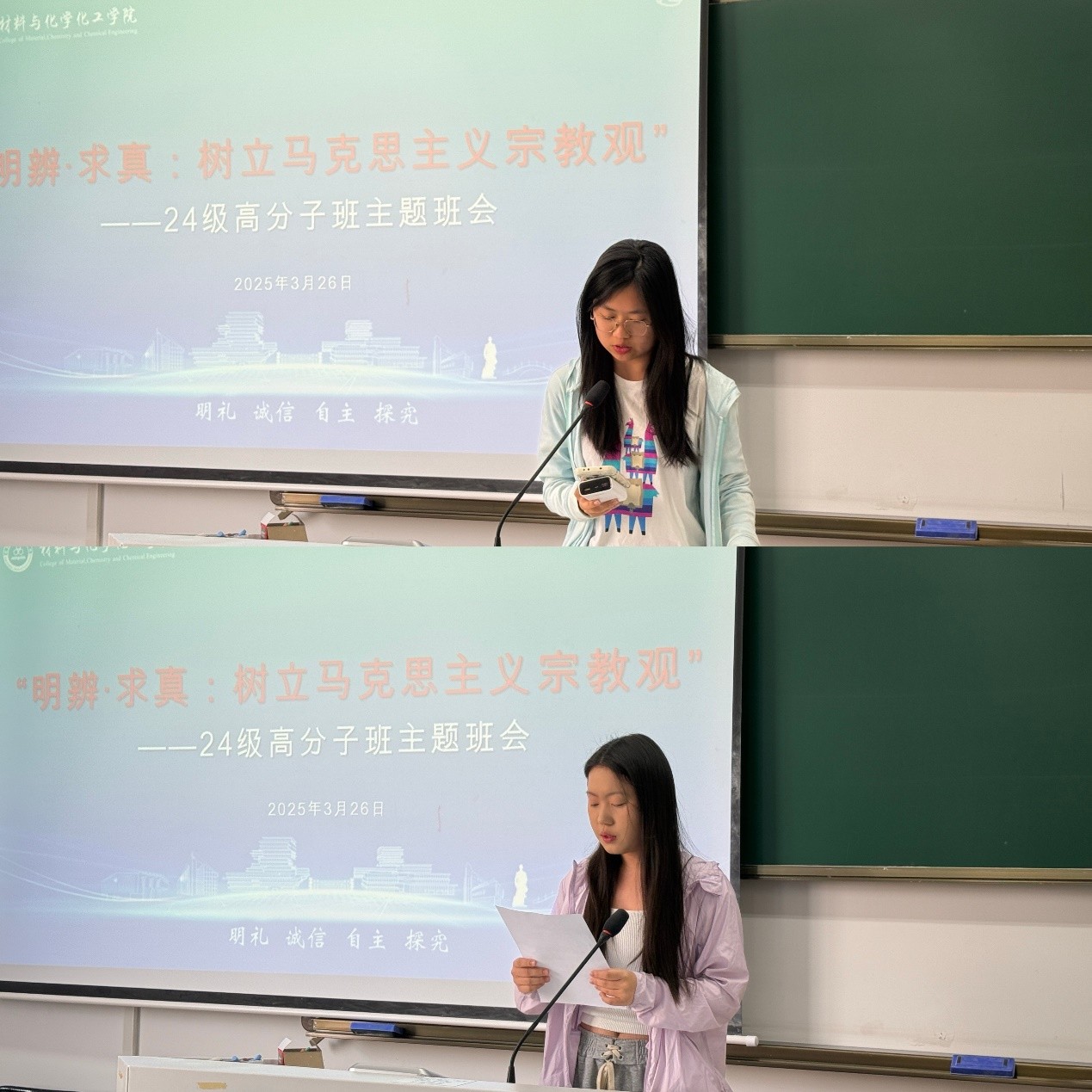 3月26日上午,24级高分子班以“明辨·求真:树立马克思主义宗教观”为主题举行了一场别开生面的主题班会,旨在引领同学们如何正确认识马克思主义宗教观,了解党的民宗政策。做爱视频 党委书记来国灿作为班级结对领导参加本次主题班会并发表讲话。学院党委副书记管庆江、辅导员赖雷雨参加班会。