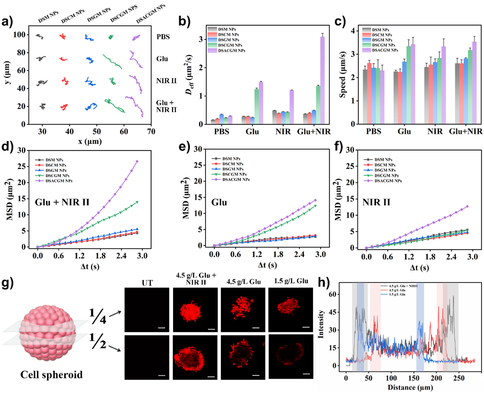 光热性能方面,DSACGM NPs 在 NIR - II 激光照射下表现出良好的升温能力,光热转换效率较高。CO 释放能力得到验证,不同浓度下 CO 释放量可测。GOD 封装后虽活性有所降低但仍保留大部分催化活性,催化葡萄糖(Glu)产生过氧化氢(H₂O₂)。在酸性条件下,DSACGM NPs 能通过 MnCO 与 H₂O₂反应释放 CO 和 Mn²⁺,引发类芬顿反应产生∙OH,增强细胞内氧化应激。DSACGM NPs 纳米材料具有出色马达性能。其可通过化学(Glu 反应释放 CO)与光(AuRods 光热效应)驱动产生自主运动,运动受 Glu 浓度和光功率密度调控,且在高 Glu 和 NIR - II 照射下细胞摄取增强、肿瘤穿透深度增加(图2)。