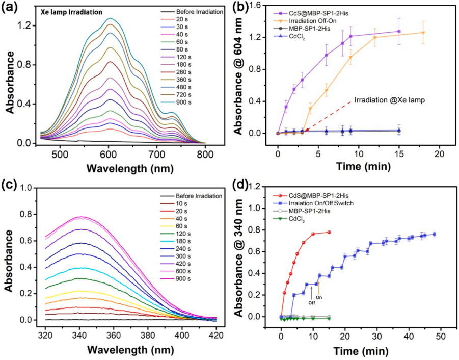刘俊秋教授团队基于蛋白质基因工程与自组装策略发展了基于原位生物合成肽锚定的蛋白-半导体杂化蛋白纳米片,构建了高效产生氢的人工光催化系统(图1)。以具有环形结构的SP1蛋白为基础,将金属结合肽(MBP)融合到其 N 端,通过点突变在侧表面引入组氨酸得到MBP-SP1-2His变体蛋白。该蛋白能为CdS QDs的原位生长提供空间限制,形成的CdS@MBP-SP1-2His杂化物具有良好的分散性,与游离CdS相比,其吸收峰和荧光特性独特,在光催化还原MV²⁺和NAD⁺反应中表现出更强的生成光生电子能力(图2)。
