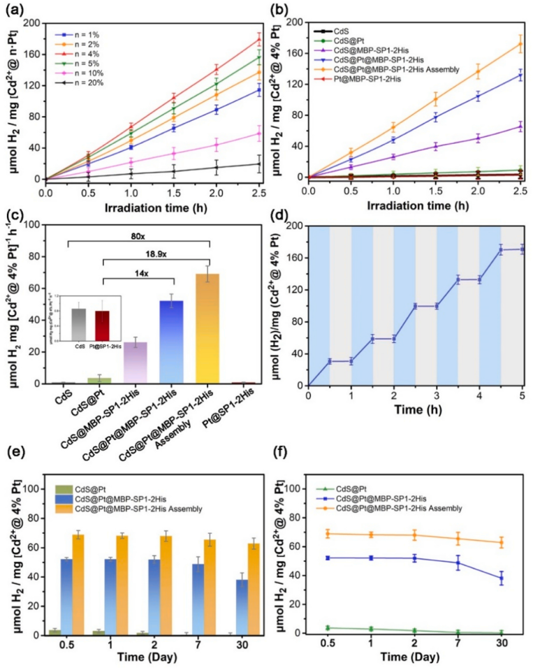 为进一步提高光催化性能,采用温和的方法在 CdS 表面负载Pt纳米粒子形成 CdS@Pt@MBP-SP1-2His。Pt的负载抑制了光生电子-空穴的复合,显著提高了光催化产氢速率,其组装体的产氢速率高达69100 μmol h⁻¹ (g Cd²⁺)⁻¹,是游离 CdS的80倍。同时,Pt 掺杂后的系统稳定性也得到提高,30天后仍能保持91.2% 的催化效率(图4)。