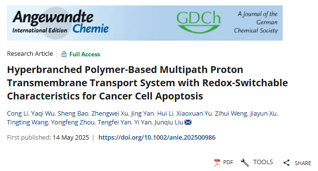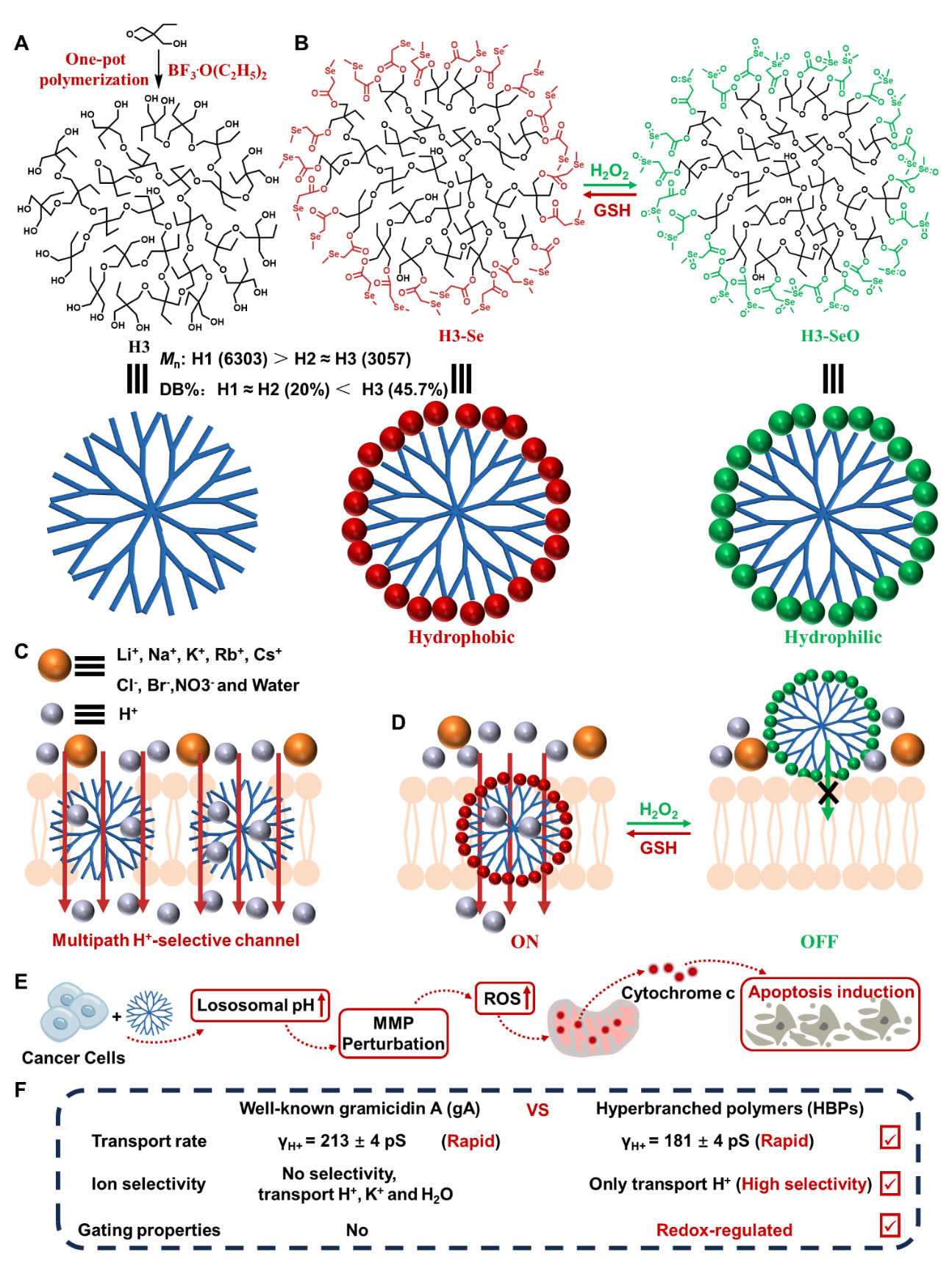 近日,做爱视频 刘俊秋教授团队在Angewandte Chemie International Edition上发表了题为“Hyperbranched Polymer-Based Multipath Proton Transmembrane Transport System with Redox-Switchable Characteristics for Cancer Cell Apoptosis”的研究论文,创新性地提出了一种利用超支化聚合物构建了高效人工质子跨膜传输系统的策略,并将该人工质子通道用于抗癌治疗。首先通过一锅法阳离子开环聚合反应,成功制备了具有仿生多路径质子传输特性的超支化聚合物H3。该体系通过构建多重氢键链,像天然质子通道一样实现了选择性质子传输,同时有效阻隔其他离子跨膜转运。电生理测试显示,H3的质子传导能力(γH+ = 181 ± 4 pS)接近天然质子通道蛋白水平。在抗癌应用方面,H3能特异性扰乱癌细胞内的pH稳态,导致溶酶体碱化和线粒体功能障碍,对U87MG和B16F10细胞分别表现出0.23 μM和1.04 μM的半抑制浓度。特别值得关注的是,通过引入动态硒醚基团开发的H3-Se,首次实现了基于亲水性变化的质子传输活性可逆调控(GSH/H2O2响应)。这项研究不仅为设计新型仿生离子通道提供了范例,也为开发精准抗癌疗法提供了新思路。