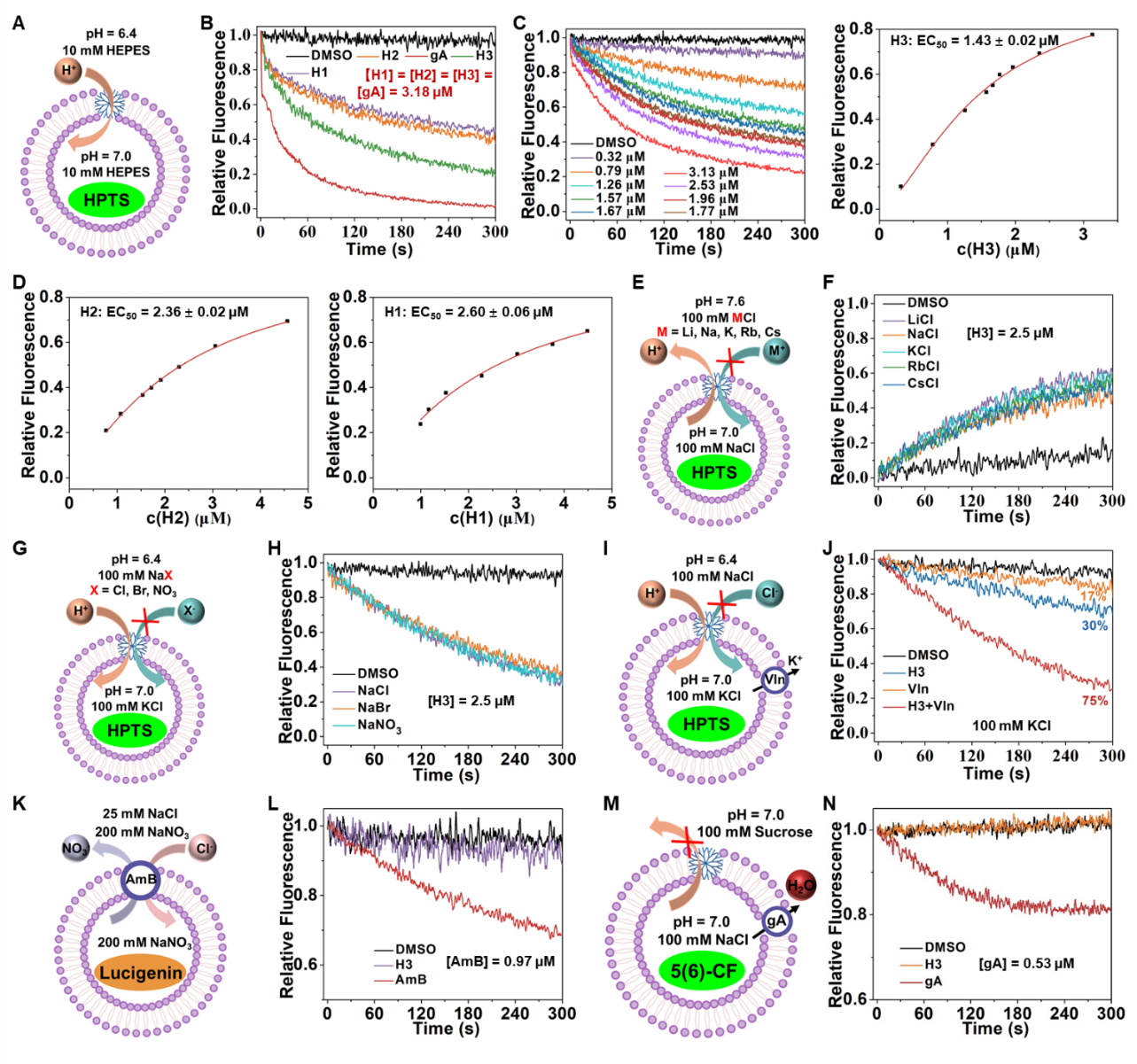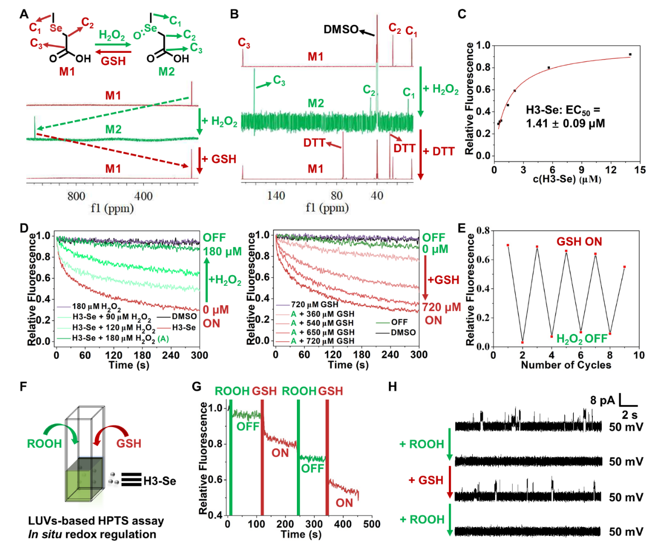 基于LUVs的HPTS荧光分析(内腔溶液:10 mM HEPES,pH 7.0;外腔溶液:10 mM HEPES,pH 6.4)被用于评估H3-Se的可调控特性。研究显示(图4D),当H3-Se与不同浓度H2O2预孵育1分钟后,随着氧化剂浓度增加,HPTS探针的相对荧光强度逐渐升高,表明质子转运活性相应降低。在180 μM H2O2条件下,H3-Se的质子转运活性降至与DMSO对照组相当的水平。而后续加入还原剂GSH可使转运功能恢复,这种通过交替添加H2O2/GSH实现的"开关"调控可循环多次,但伴随循环次数增加会出现渐进性疲劳效应(图4E)。