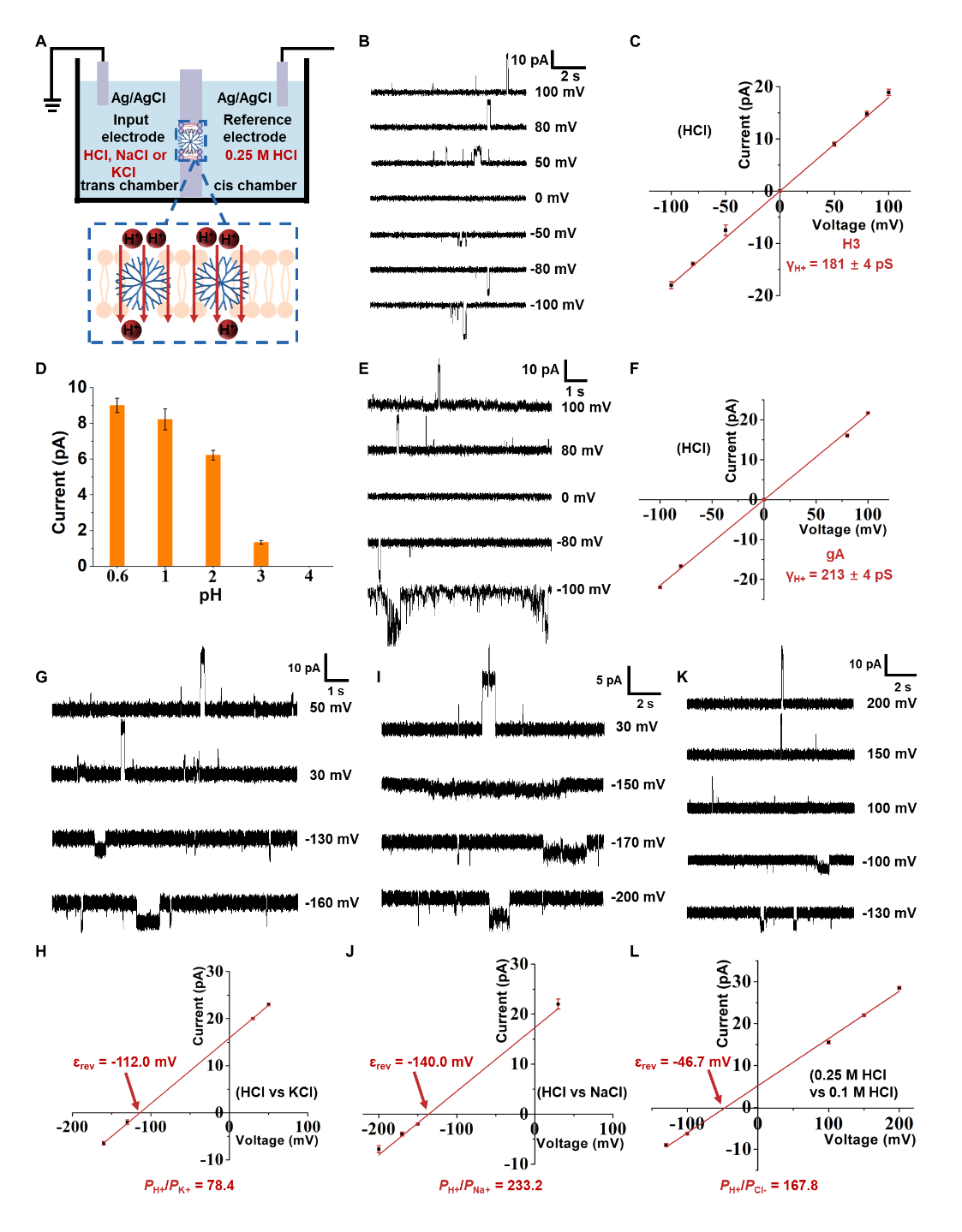 为阐明该超支化聚合物(HBP)质子转运系统的作用机制,研究团队在平面脂质双分子层中进行了膜片钳实验(实验条件:cis与trans腔室均为0.25 M HCl溶液,pH=0.6,图2A)。如图2B所示,当向trans腔室加入H3(0.1 μM)后,可观察到典型的方波状质子通道信号,表明H3介导的质子转运遵循通道机制而非载体机制。通过电流-电压(I-V)曲线拟合测得质子电导率(γH+)为181±4 pS(图2C)。研究还测定了相同电压(50 mV)下不同pH值(0.6-4)的电流变化。结果显示:pH=1时的电流值略低于pH=0.6(图2D);当pH从1升至3时,电流值随pH升高而递减;在pH=4时未检测到电流信号,可能与质子浓度过低有关。