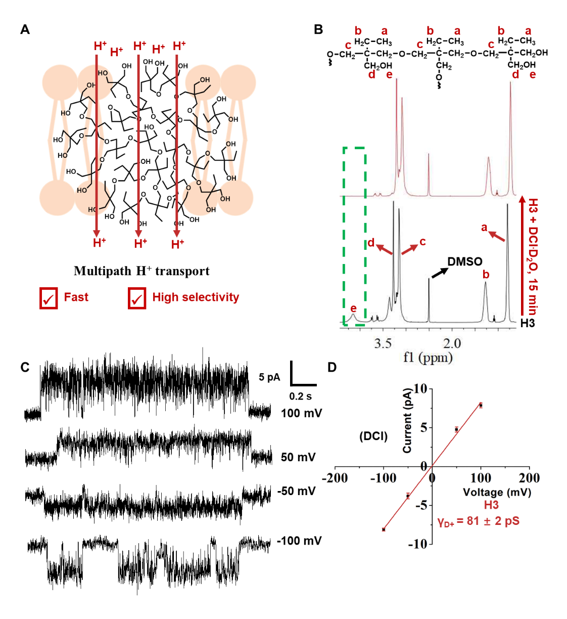 天然通道蛋白(NPCs)富含氮、氧原子的氨基酸侧链残基,能够形成大量氢键网络(HBCs),通过"跳跃-转向"机制实现质子跨膜转运。鉴于H3分子中高密度的氧原子分布,我们推测其可构建多重HBCs网络,实现高效选择性质子传输(图3A)。为验证这一机制,研究人员开展了氘代实验:当H3与DCl·D2O作用15分钟后,其表面羟基信号(He,δ=4.15 ppm)完全消失(图3B),表明溶液中的氘原子取代了这些活泼氢。这不仅证实H3作为跨膜骨架的功能,更揭示其活性基团直接参与质子传输过程。