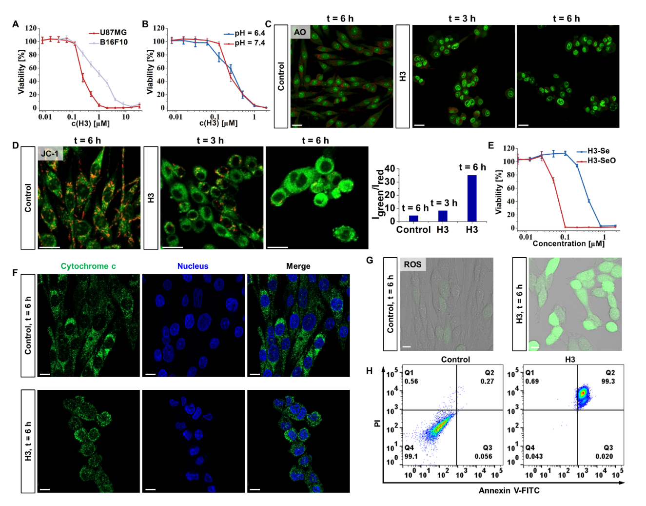 在证实H3在脂质体模型中具有快速质子转运能力后,我们进一步探究了其抗肿瘤潜力。采用CCK-8法检测H3对黑色素瘤B16F10和恶性胶质瘤U87MG细胞的毒性,结果显示(图5A):H3对两种癌细胞的半抑制浓度(IC50)分别为1.04 μM和0.23 μM,其中对U87MG细胞表现出更强的杀伤效果。鉴于实验条件下细胞内外的H+浓度梯度有限,我们推测H3可能通过细胞摄取进入亚细胞器(如线粒体和溶酶体),进而破坏其膜质子转运。为验证这一假设,我们将细胞培养液pH从7.4调至6.4以构建跨膜pH梯度。如图5B所示,两种pH条件下H3的细胞毒性无显著差异,证实其作用靶点位于细胞内而非细胞膜。通过吖啶橙(AO)染色发现(图5C),H3处理6小时后U87MG细胞的溶酶体红色荧光显著减弱,表明其内部pH升高。这种碱性化可能破坏溶酶体-线粒体交互作用,导致线粒体损伤。JC-1探针检测显示(图5D),H3处理组线粒体膜电位(MMP)显著降低,其绿红荧光强度比是对照组的7.8倍。免疫荧光结果进一步证实(图5F),与对照组颗粒状分布不同,H3处理后的细胞色素c呈现弥散分布,表明其从线粒体释放至胞质。这些证据共同表明,H3通过破坏肿瘤细胞内溶酶体和线粒体的质子稳态,最终诱发细胞凋亡。