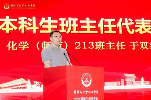 化学(师范)213班主任于双江教授作为本科生班主任代表发言,他深情回顾与学生相处的点滴,欣慰于大家的蜕变。他提出三点希望:永葆热爱,寓教于学,探索不息,为化学学科的发展继续贡献力量;坚守勤勉,以勤奋为桨,持续学习,破浪前行,抵达成功的彼岸;心怀阳光,以乐观积极的心态披荆斩棘,遇见更好的自己,拥抱幸福。他表示老师们将永远是同学们的坚强后盾。