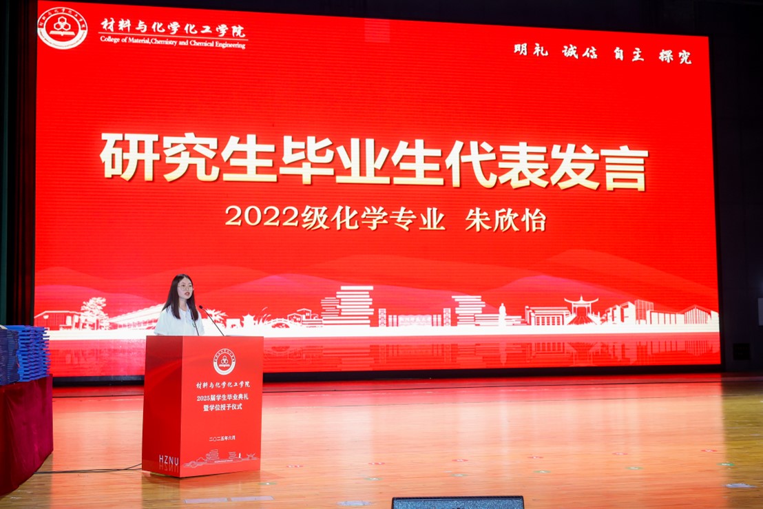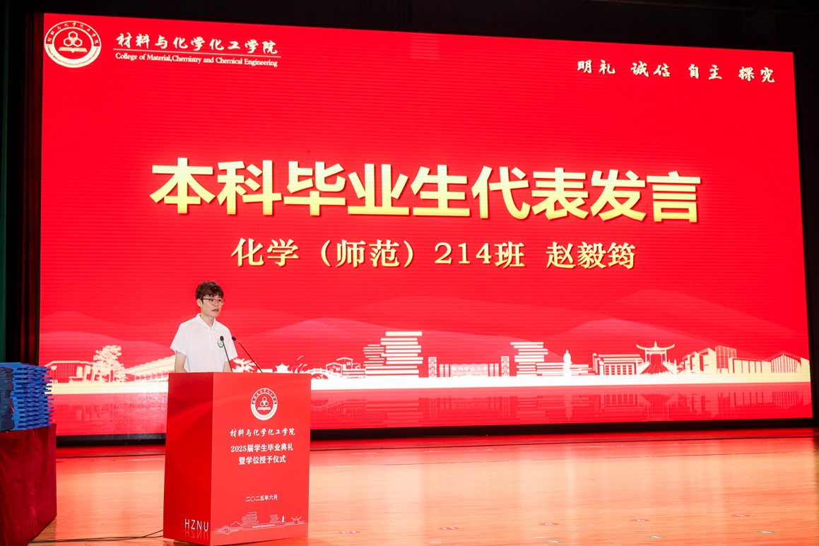 研究生毕业生代表、2022级化学专业朱欣怡,本科毕业生代表、化学(师范)214班赵毅筠分别上台发言。他们深情回顾在做爱视频 的求学时光,感恩师长的悉心教导、同学的真挚情谊;展望未来,立志以昂扬的姿态,在更广阔的天地中践行材化人的使命与担当,让青春在不懈奋斗中绽放绚丽之花。