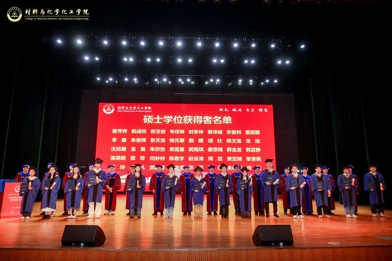章鹏飞代表学院致辞,他向全院547名2025届本研毕业生送上热烈祝贺和美好祝愿,衷心感谢师长、家长和亲友们的辛勤付出和陪伴。他深情回顾了同学们在校期间的奋斗与成长,与学校和学院一起在青春的画卷上勾勒出最迷人的风景,实现了同频共振、双向奔赴。他以《越山丘 藏岁月 书华章》为题给毕业生讲授在校的“最后一课”,提出三点期望:一是越山丘,淬炼成长锋芒,在跨越挫折中成长成熟,收获成功与领悟;二是藏岁月,定格温暖时光,珍惜身边温暖瞬间,从中汲取前行力量;三是书华章,绘就出彩人生,守护心中热爱,在坚守中书写属于自己的精彩篇章。希望在未来的人生道路上,以无畏为剑、珍惜为舟、热爱为帆,将理想信念和家国情怀转化为感恩奋进的力量,融入个人成长和时代发展的澎湃浪潮,在祖国大地上继续书写属于材化人的才华与荣光!