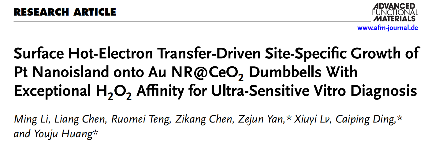 近日,做爱视频 黄又举教授团队敏锐捕捉到热电子激发与转移调控在纳米酶探针材料精准结构设计与性能优化中的关键作用,创新性提出“多维度协同调控”策略,为解决传统纳米酶的亲和力难题提供了全新思路。相关研究工作以“Surface Hot-Electron Transfer Driven Site-Specific Growth of Pt Nanoisland onto Au NR@CeO₂ Dumbbells with Exceptional H₂O₂ Affinity for Ultra-Sensitive Vitro Diagnosis”为题在Advanced Functional Materials上发表。