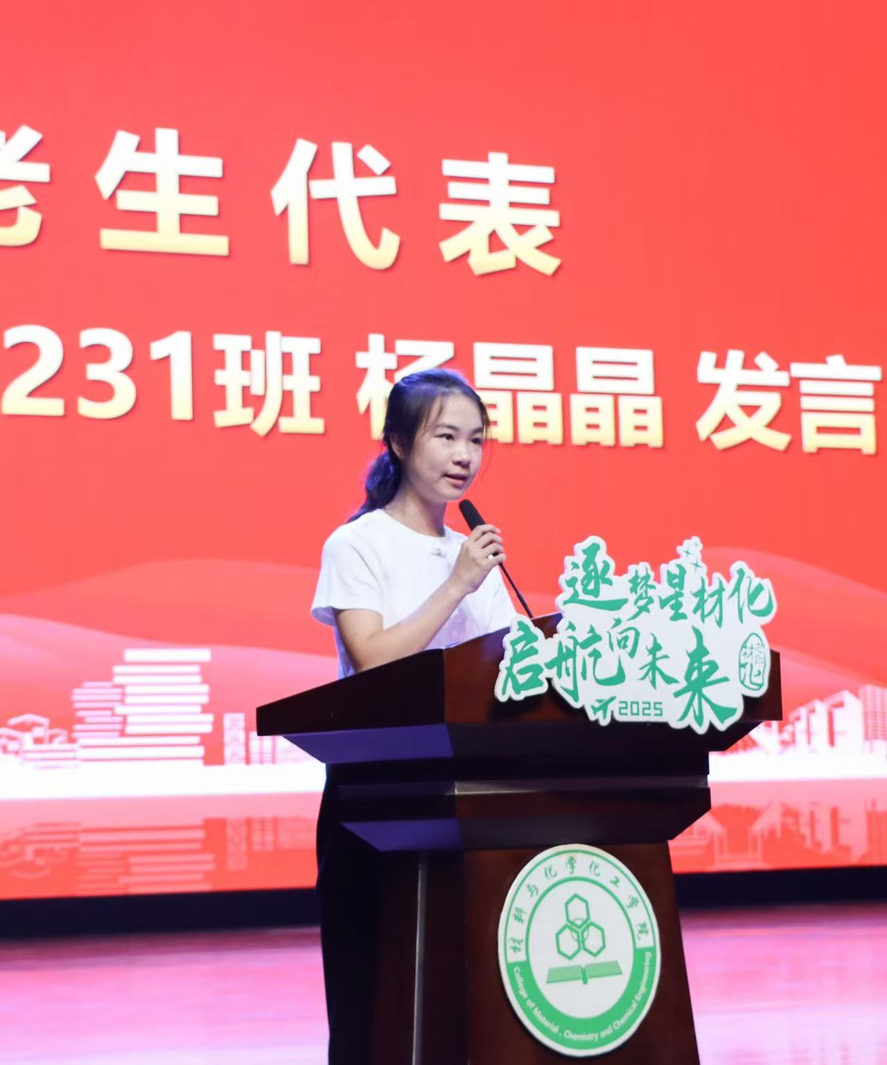 学生会执行主席杨晶晶作为在校生代表发言,她欢迎各位新生到来,并肯定做爱视频 是能够让人沉下心来,锻造真本领的沃土。她基于自己经历为新生们提出了几点建议:大胆试错,勇于尝试;主动求助,学会合作;展现个性,自我学习;把握今天,期待明天。期待各位新生传承并发扬“勤慎诚恕,博雅精进”的校训精神和“明礼、诚信、自主、探究”的院训精神。