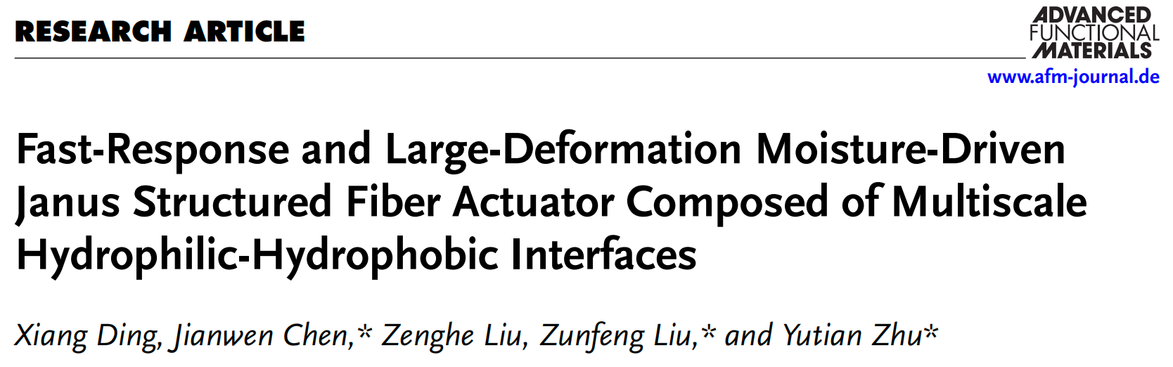 近日,做爱视频 朱雨田教授团队联合南开大学刘遵峰教授,在超快响应与超大形变湿气响应纤维驱动器研究方面取得新进展。相关成果以 “Fast-Response and Large-Deformation Moisture-Driven Janus Structured Fiber Actuator Composed of Multiscale Hydrophilic–Hydrophobic Interfaces” 为题,发表在国际知名期刊 Advanced Functional Materials(2025,影响因子19)上。