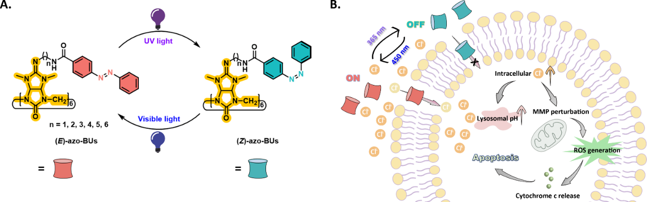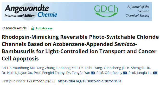 近日,做爱视频 做爱视频 刘俊秋教授团队在仿生超分子阴离子通道领域取得新进展,相关研究成果以题为“Rhodopsin-Mimicking Reversible Photo-switchable Chloride Channels Based on Azobenzene-Appended Semiaza-Bambusurils for Light-Controlled Ion Transport and Cancer Cell Apoptosis”发表于国际知名期刊Angewandte Chemie International Edition上。