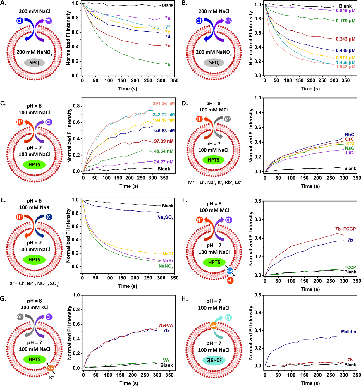 首先,在脂质体模型中对不同链长的偶氮苯半氮杂竹环离子传输性能进行了测试,并对其H⁺/Cl⁻同向转运及Cl⁻/NO3⁻反向转运的浓度依赖性行为进行了测试。通过改变脂质体外相碱金属阳离子或阴离子,确定了离子转运过程几乎与阳离子种类变化无关,而阴离子选择性则符合Hofmeister序列,表明其由阴离子去水合能主导。随后,通过测试通道分子与质子载体FCCP和K⁺离子载体缬氨霉素是否存在协同效应,确定了通道选择性为Cl⁻> H⁺> OH⁻。同时,膜泄露实验结果证明了该通道并非通过在膜上形成纳米孔,非特异性泄露膜内物质,而是高选择性的离子通道。光控实验显示,当偶氮苯处于反式时,通道具有高效的氯离子转运能力;而当偶氮苯处于顺式时,离子转运能力几乎完全丧失,并且这种行为可以在脂质体内通过原位光照进行转化,这可能是由于极性变化与位阻共同作用的结果。