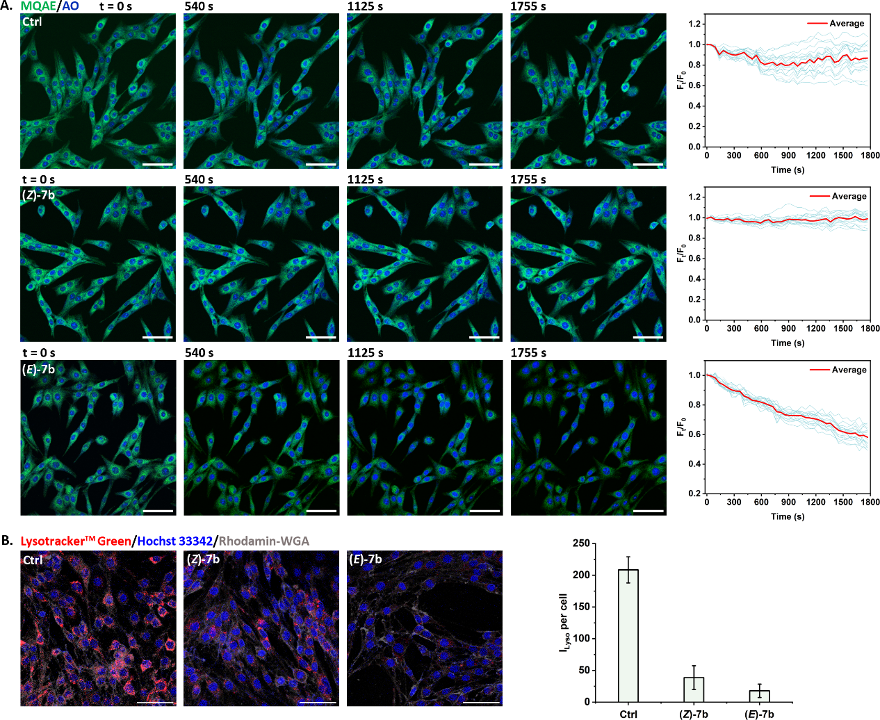 细胞实验结果显示,脂质体中活性最佳的分子7b对U87-MG等3种细胞均具有优良的抗增殖活性,通过机制研究,这一活性与胞外氯离子剧烈内流和溶酶体去酸化紧密相关。通过共聚焦显微镜成像对细胞内线粒体膜电位、活性氧水平、细胞色素c的分布,以及采用流式细胞术对细胞进行分析,证明氯离子内流破坏了细胞的线粒体膜电位,促进了大量活性氧的生成,进而导致细胞色素c从线粒体中释放,并诱导细胞凋亡。同时,该通道可以实现活细胞中光控离子转运与细胞凋亡。