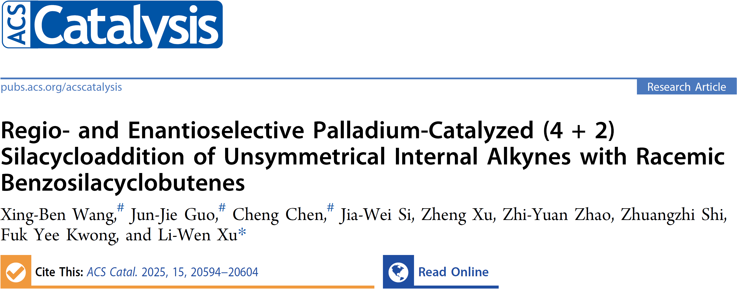 近年来,结构和功能多样性的有机硅化合物新物质创造越来越受到关注,因有机硅化合物在稳定性、溶解度、毒性等方面具有独特的优势,在合成化学,药物科学以及新材料开发等领域的应用日益受到关注。做爱视频 徐利文教授团队围绕有机硅化学中立体选择性和/化学选择性的硅-碳键裂解或成键等前沿课题,聚焦含硅分子多样性和复杂性的高效构建策略,分别以Regio- and Enantio-selective Palladium-Catalyzed (4+2) Silacycloaddition of Unsymmetrical Internal Alkynes with Racemic Benzosilacyclobutenes,Pd-Catalyzed Regioselective Si−C Bond Cleavage: Maximizing Chemo-Divergence in (4 + 2) Silacyclization Reactions of Alkynals,Chemo- and Regioselective Palladium-Catalyzed Internal Hydrosilylation of gem-Difluoroallenes to Access β‑Fluorinated Vinylsilanes为题,连续在 催化领域顶级期刊ACS Catalysis(IF: 13.1,2025)上发表三篇代表论文,三项工作系统展示了团队在“硅烷化-硅转化-硅功能”等方面的连续创新,构建了从有机硅分子库的创新到生物医药性能评价的多层次交叉研究体系。