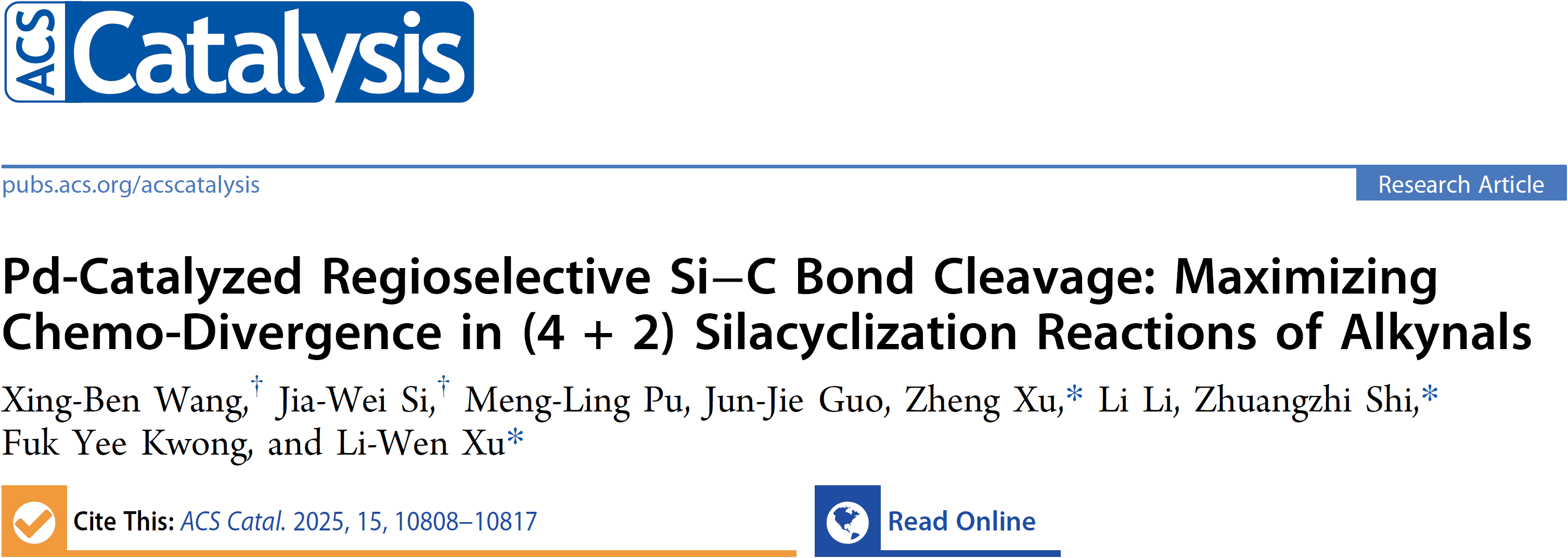 在论文Pd-Catalyzed Regioselective Si−C Bond Cleavage: Maximizing Chemo-Divergence in (4 + 2) Silacyclization Reactions of Alkynals中,团队报道了一种配体驱动的钯催化区域与化学选择性发散(4+2)硅环化反应,通过苯并硅杂环丁烷与不对称炔醛的精准调控,实现了四类二氢苯并[c]硅杂环衍生物的高选择性合成。膦配体独特的空间结构控制反应路径,展现出卓越的化学选择性控制能力,成功解决了长期存在的科学难题——包括不可控的Si-C(sp²)或Si-C(sp³)键断裂、以及不对称炔烃α位/β位选择性加成等问题。通过精准调控配体的空间位阻和电子效应,实现了该反应高收率与良好选择性构建多样性硅杂环衍生物,并经由DFT理论计算揭示了反应机理。该策略为硅杂环合成建立了多功能平台,在原子经济性、化学合成及材料科学领域具有广阔应用前景。