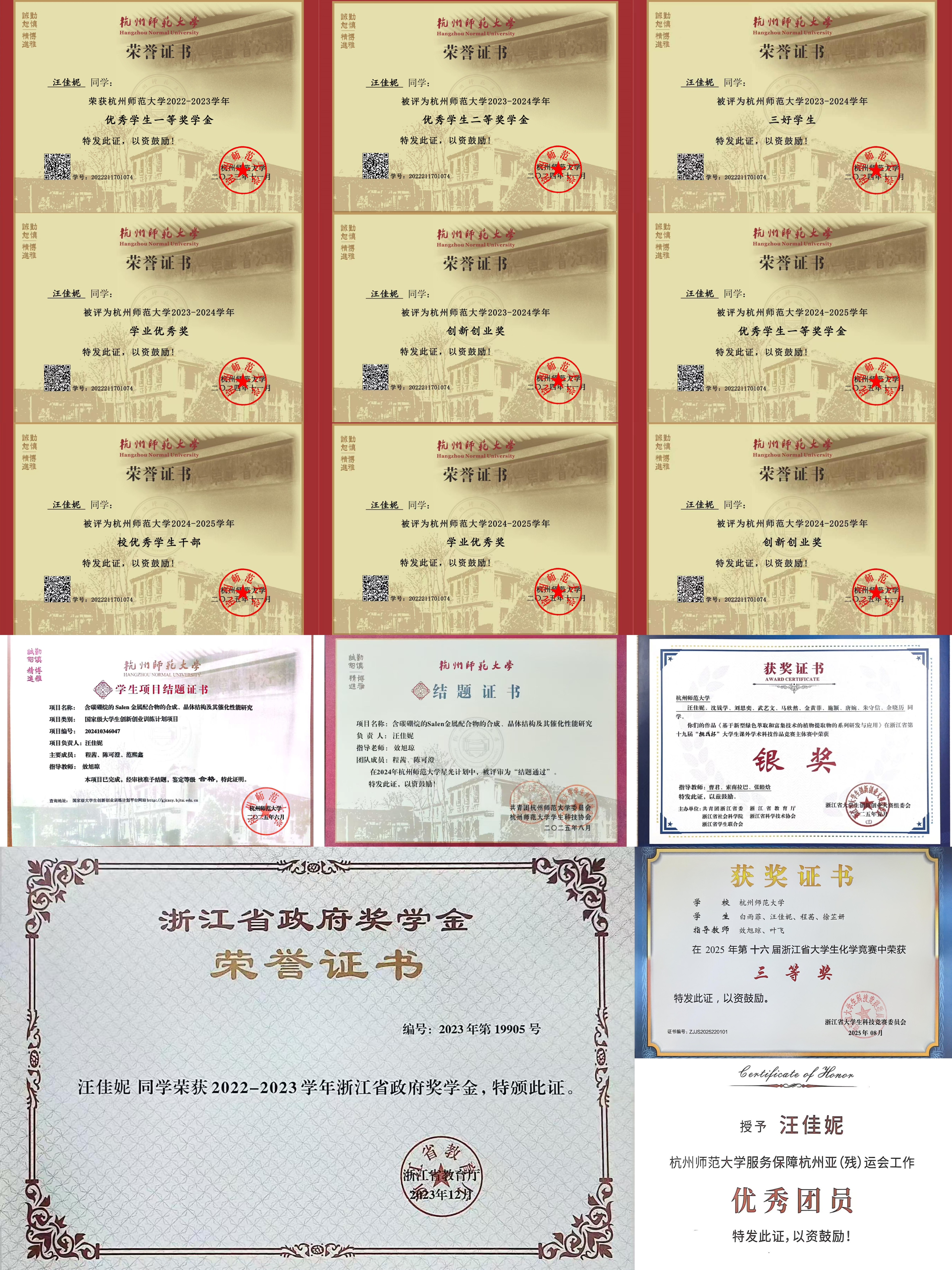 大一阶段时,夯实基础,筑牢根基,为后续保研资格获取以及理想院校申请打下夯实基础。大二阶段,则深化能力,冲刺提升。汪佳妮积极担任教授的课题组科研助理,掌握核心实验技能。与此同时,她在老师指导下完成了立项申请书的撰写,成功申请了校星光计划、国家级大学生创新创业训练计划项目。再到大三阶段,锐意进取,积累成果。作为项目负责人,汪佳妮和她的伙伴(程茜、陈可澄)从大二结束的暑假开始进行了为期一年的实验,完成了星光、国创的结题工作,并在效旭琼老师的帮助下以共同第一作者身份发表了一篇SCI论文。大三结束后的暑假,她与团队成员(白雨菲、程茜、徐芷妍)成功通过化学竞赛初赛并完成了相关课题研究,最终荣获三等奖的成绩。